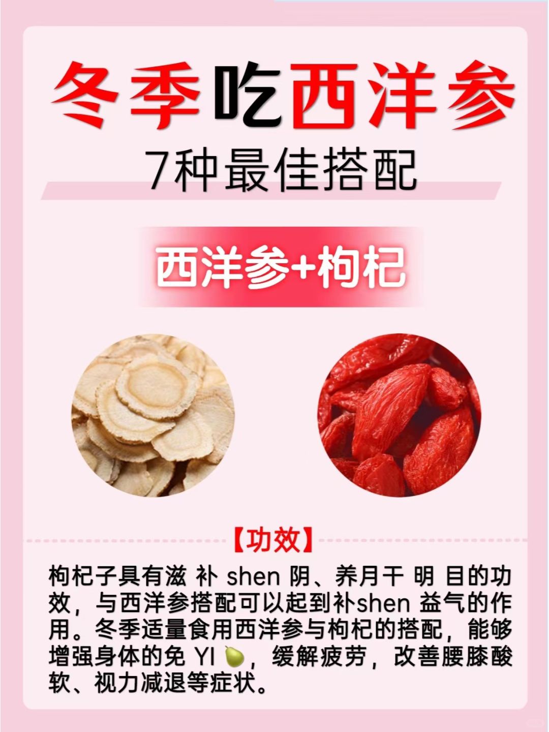 枸杞子具有滋补shen阴、养月干明目的功效,与西洋参搭配可以起到补shen益气的作用。冬季适量食用西洋参与枸杞的搭配,能够增强身体的免 YI 🍐,缓解疲劳,改善腰膝酸软、视力减退等症状。