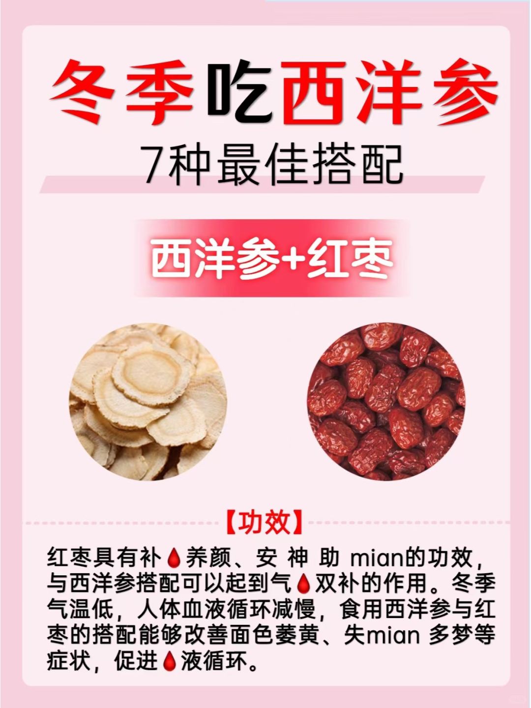 红枣具有补🩸养颜、安神助mian的功效,与西洋参搭配可以起到气🩸双补的作用。冬季气温低,人体🩸液循环减慢,食用西洋参与红枣的搭配能够改善面色萎黄、失mian多梦等症状,促进🩸液循环。