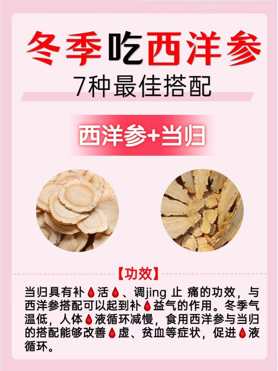 当归具有补🩸活🩸、调jing 止 痛的功效,与西洋参搭配可以起到补🩸益气的作用。冬季气温低,人体🩸液循环减慢,食用西洋参与当归的搭配能够改善🩸虚、贫🩸等症状,促进🩸液循环。