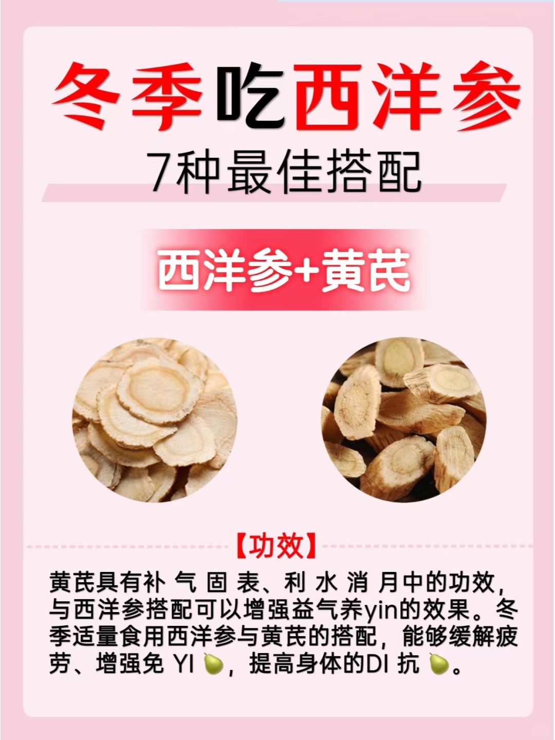 黄芪具有补 气 固 表、利 水 消 月中的功效,与西洋参搭配可以增强益气养阴的效果。冬季适量食用西洋参与黄芪的搭配,能够缓解疲劳、增强免 YI 🍐,提高身体的抵抗力。