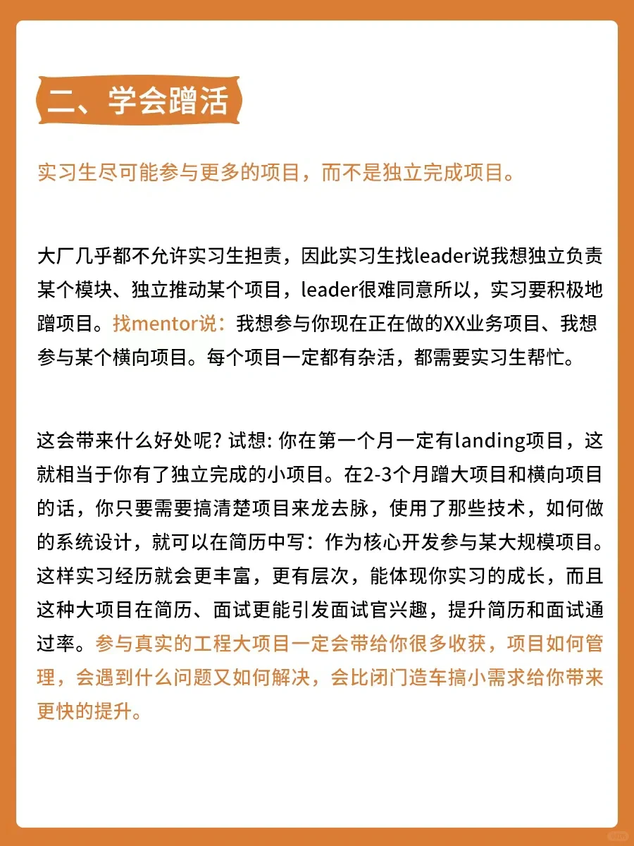 👉大厂几乎都不允许实习生担责,因此实习生找leader说我想独立负责某个模块、独立推动某个项目,leader很难同意所以,实习要积极地