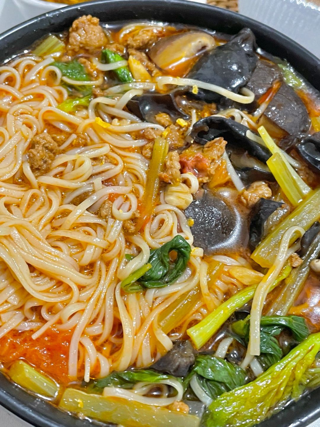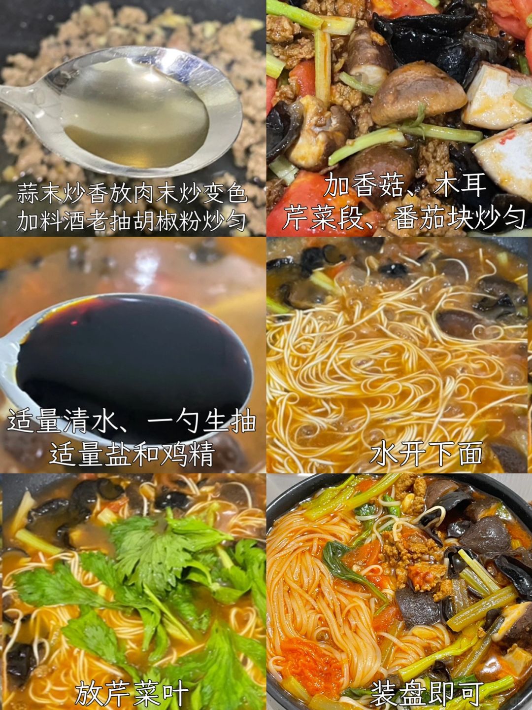 1⃣️蒜末炒香,肉末炒变色。加料酒老抽,花椒粉炒匀。加香菇、木耳、芹菜段、番茄炒匀。
