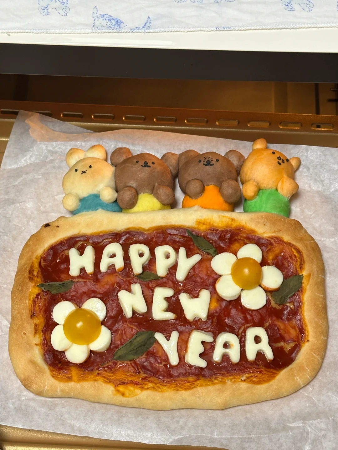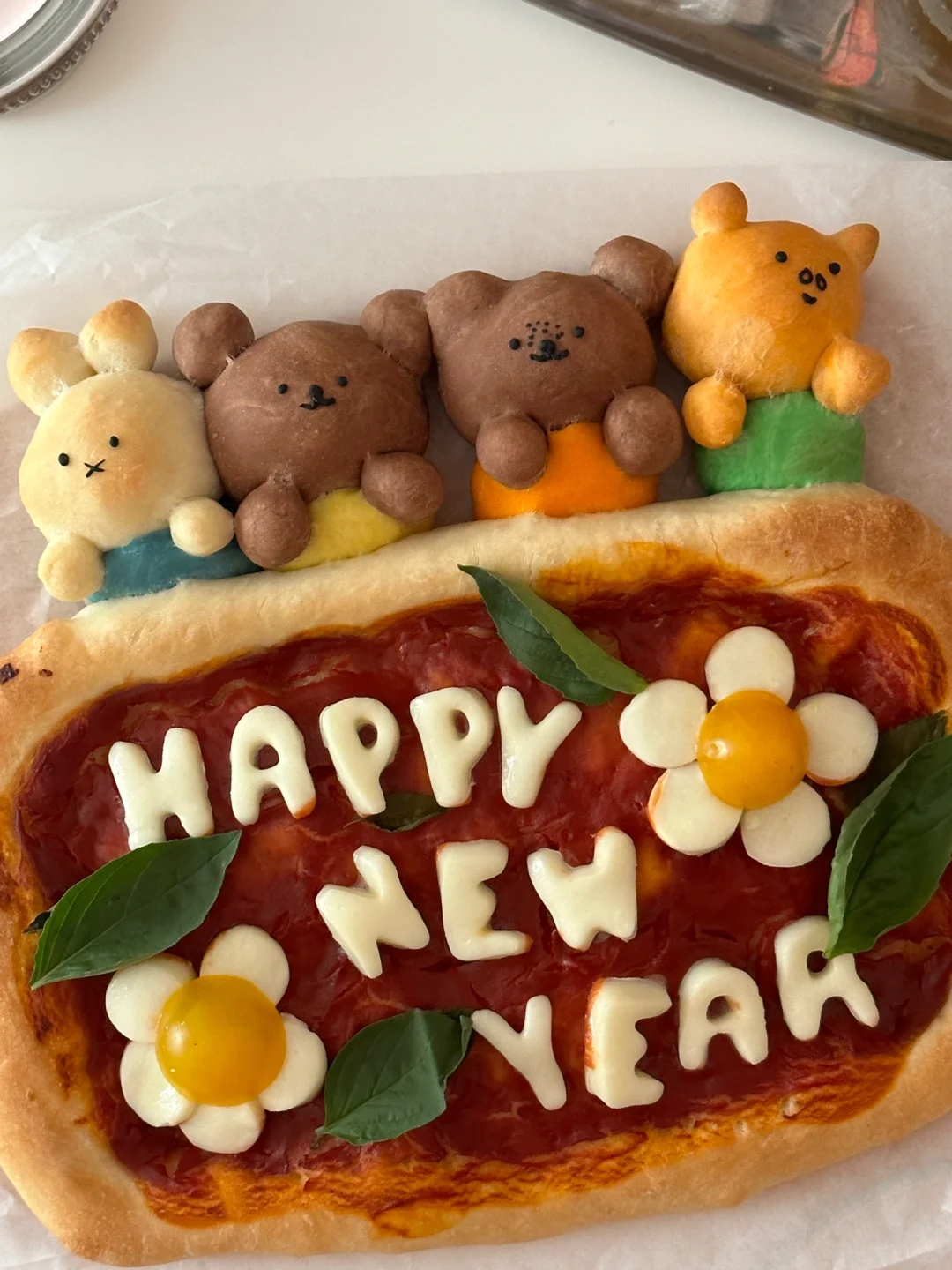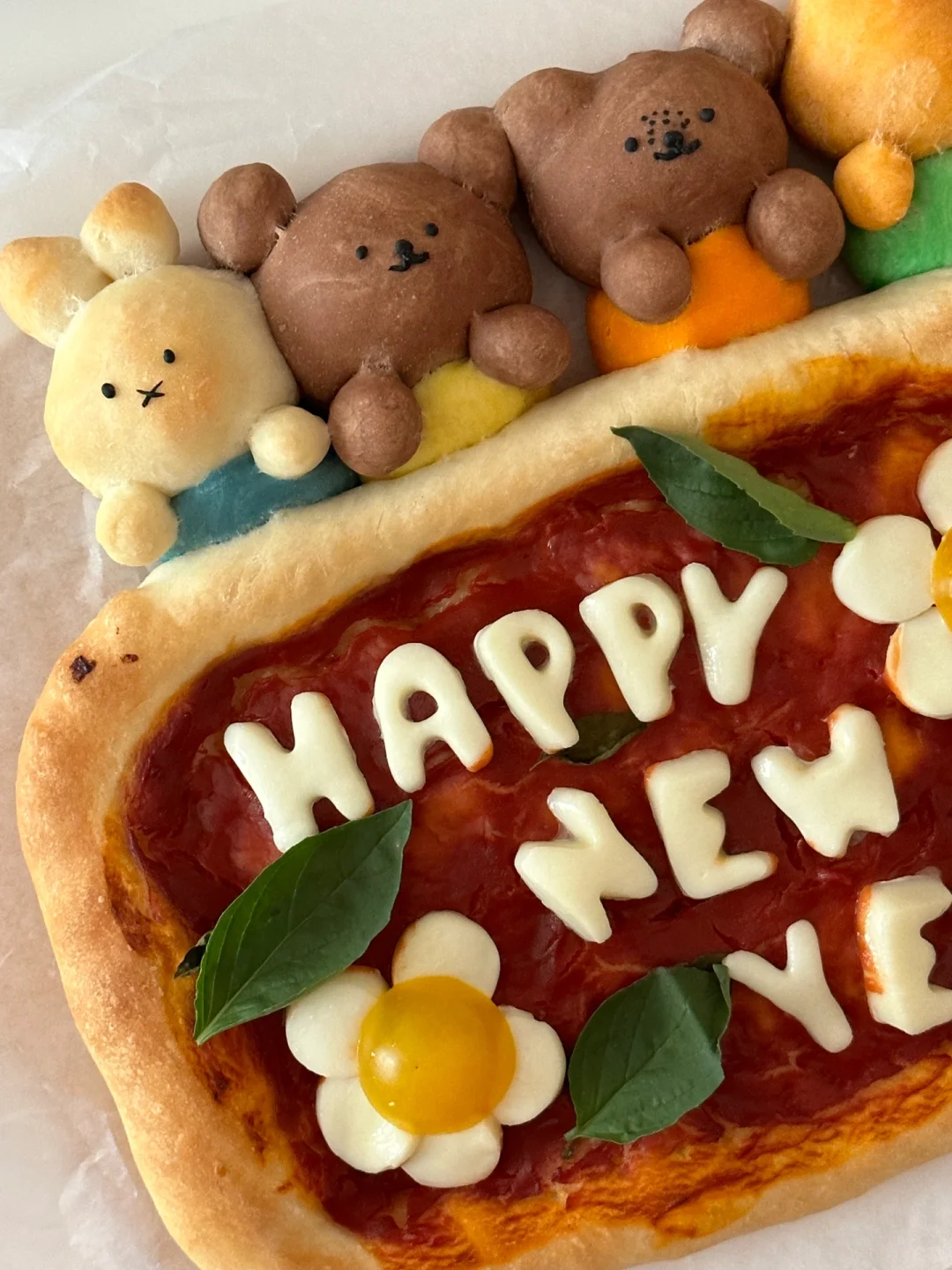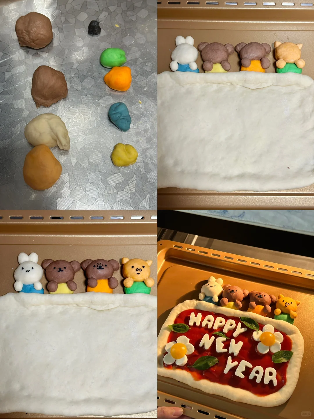 跨年夜的餐桌上制作出这样一份可爱的pizza,不敢想象吃到的人会有多幸福[两颗心R][两颗心R][两颗心R][萌萌哒R][萌萌哒R][萌萌哒R] 所需材料: 高筋面粉 130g,低筋面粉50g,100g水(因面粉吸水性不同,水量仅为参考),3g盐,8g砂糖,15g 橄榄油,3g酵母 制作步骤: ①将披萨饼皮所需材料全部混合,揉匀光滑 ②盖上保鲜膜发酵一个小时左右至两倍大 ③面团拿出按压排气,分出100g制作米菲和他的朋友造型,剩余面团放在不粘烤盘上整形成长方形 ④100g面团均分成四份,每块25g,再从每一小块里分出5g制作衣服部分(黄色,橙色,绿色,蓝色 可食用色素调色) ⑤剩下的部分用可可粉和橙色色素上色 ⑥按照图示捏出米菲和他的朋友们形象 ⑤面饼部分用叉子扎孔,涂上番茄酱,铺上罗勒叶 ⑤烤箱预热210°,烘烤20分钟左右(期间观察上色情况,及时在造型处加盖锡纸,防止上色过深) ⑥新鲜奶酪球切片,用模具刻出happy new year字母,摆在出炉的披萨上,利用余热让奶酪微微融化,最后点缀上新鲜罗勒叶和小番茄 [飞吻R]快来交作业吧!