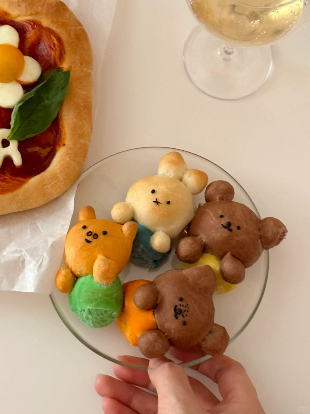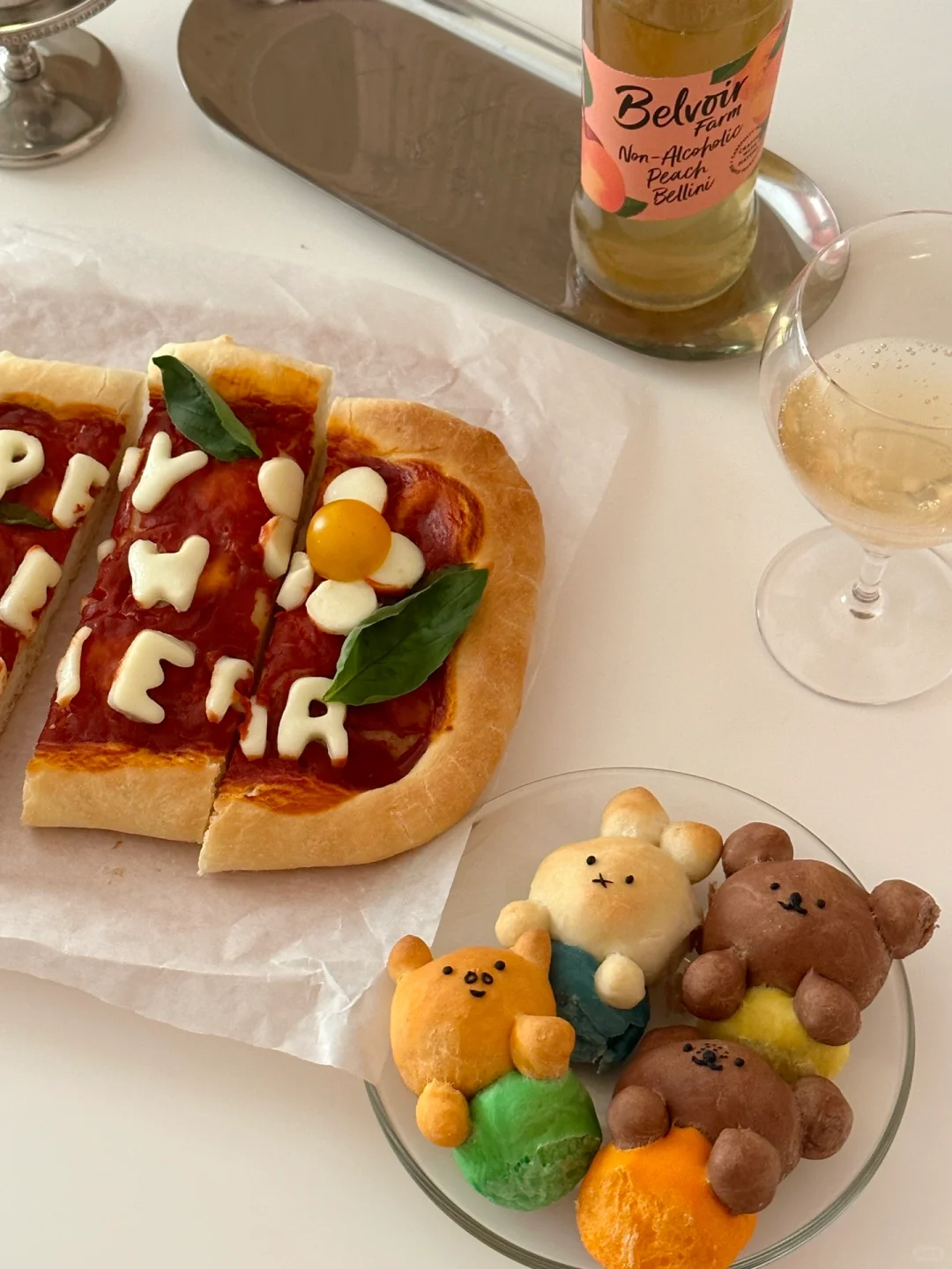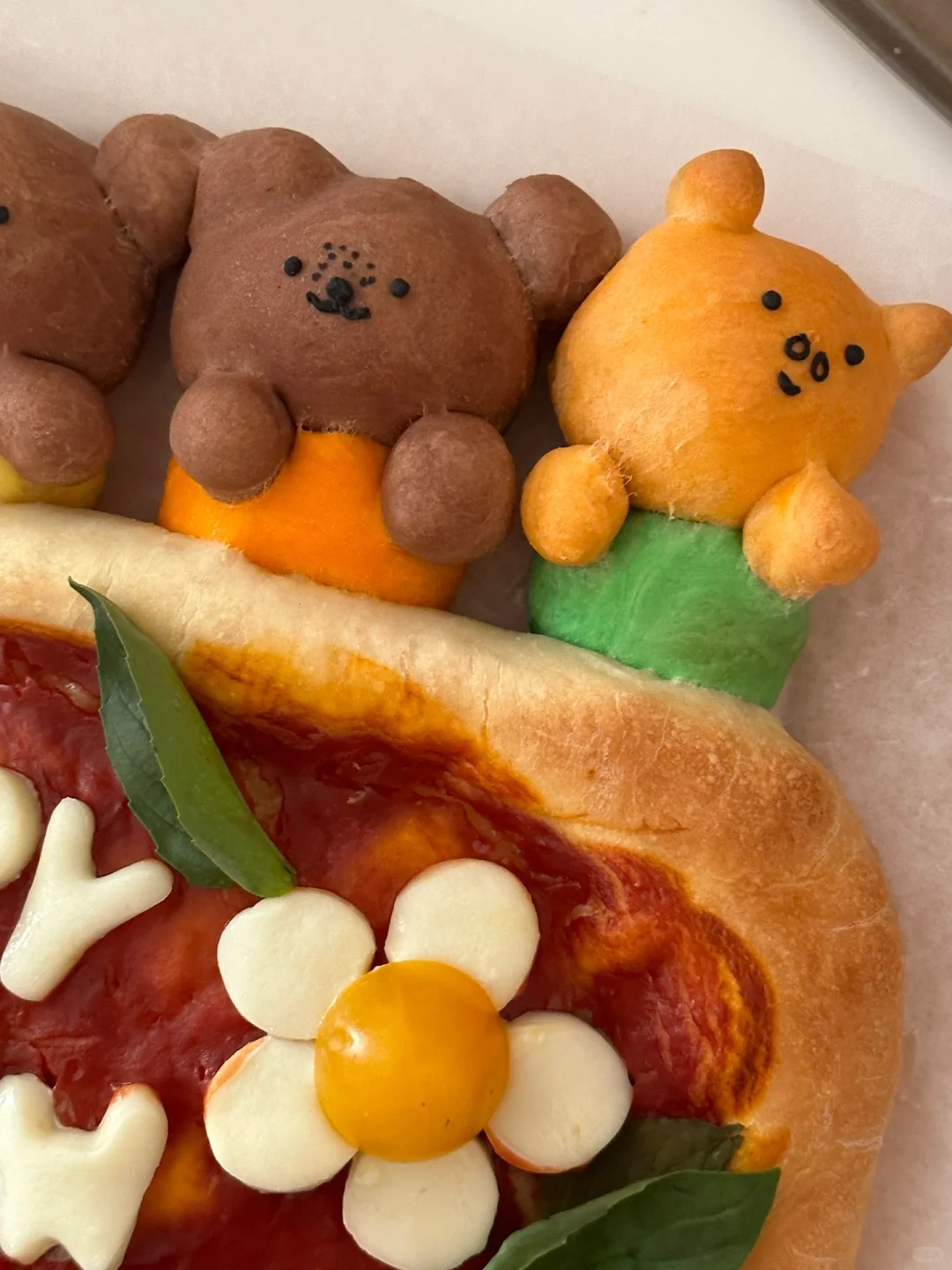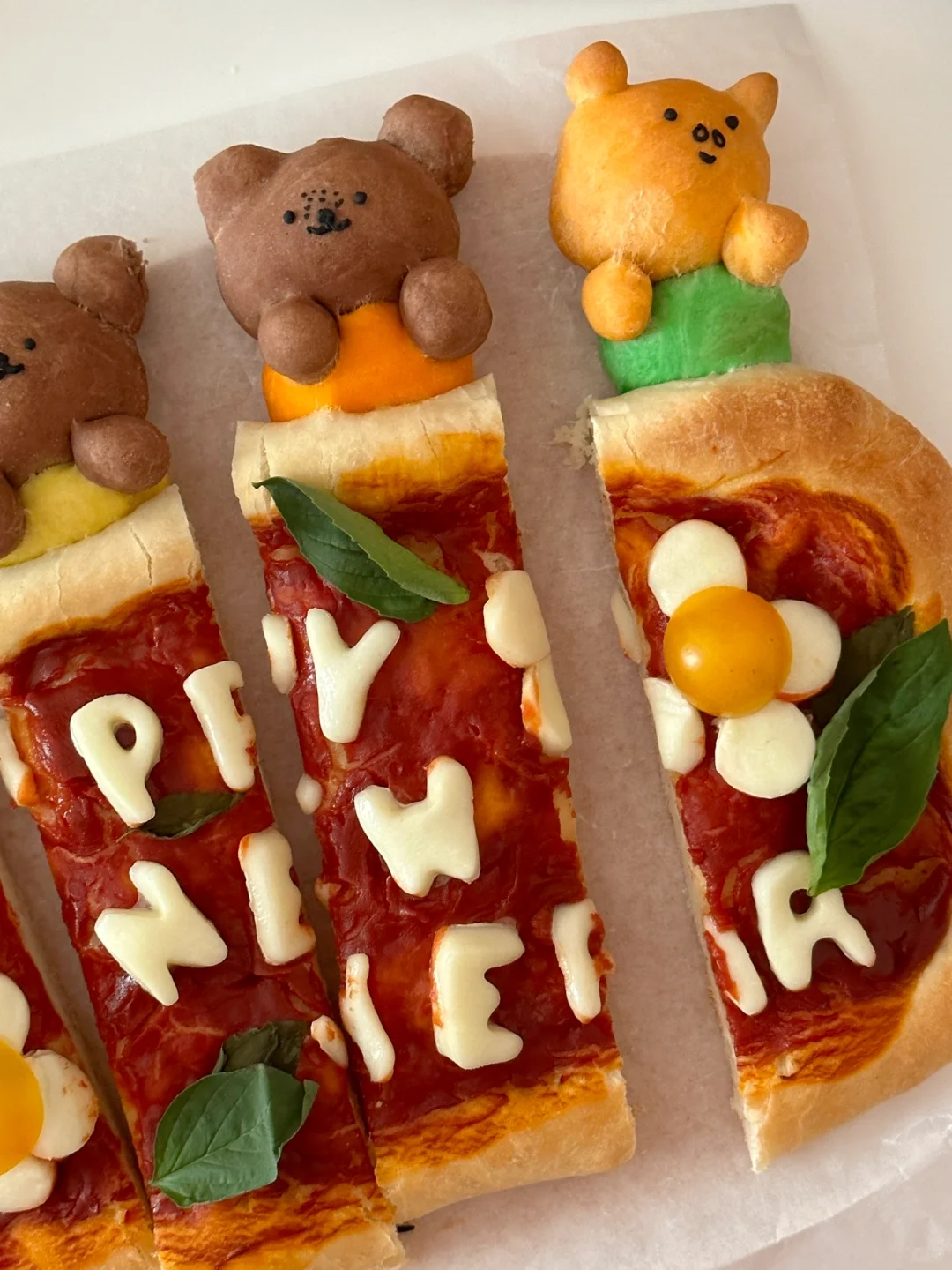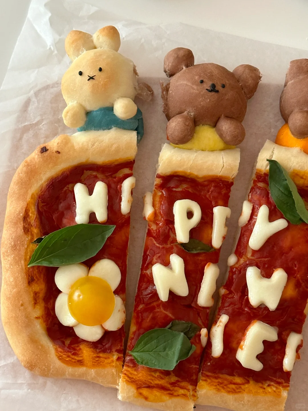跨年夜的餐桌上制作出这样一份可爱的pizza,不敢想象吃到的人会有多幸福[两颗心R][两颗心R][两颗心R][萌萌哒R][萌萌哒R][萌萌哒R] 所需材料: 高筋面粉 130g,低筋面粉50g,100g水(因面粉吸水性不同,水量仅为参考),3g盐,8g砂糖,15g 橄榄油,3g酵母 制作步骤: ①将披萨饼皮所需材料全部混合,揉匀光滑 ②盖上保鲜膜发酵一个小时左右至两倍大 ③面团拿出按压排气,分出100g制作米菲和他的朋友造型,剩余面团放在不粘烤盘上整形成长方形 ④100g面团均分成四份,每块25g,再从每一小块里分出5g制作衣服部分(黄色,橙色,绿色,蓝色 可食用色素调色) ⑤剩下的部分用可可粉和橙色色素上色 ⑥按照图示捏出米菲和他的朋友们形象 ⑤面饼部分用叉子扎孔,涂上番茄酱,铺上罗勒叶 ⑤烤箱预热210°,烘烤20分钟左右(期间观察上色情况,及时在造型处加盖锡纸,防止上色过深) ⑥新鲜奶酪球切片,用模具刻出happy new year字母,摆在出炉的披萨上,利用余热让奶酪微微融化,最后点缀上新鲜罗勒叶和小番茄 [飞吻R]快来交作业吧!