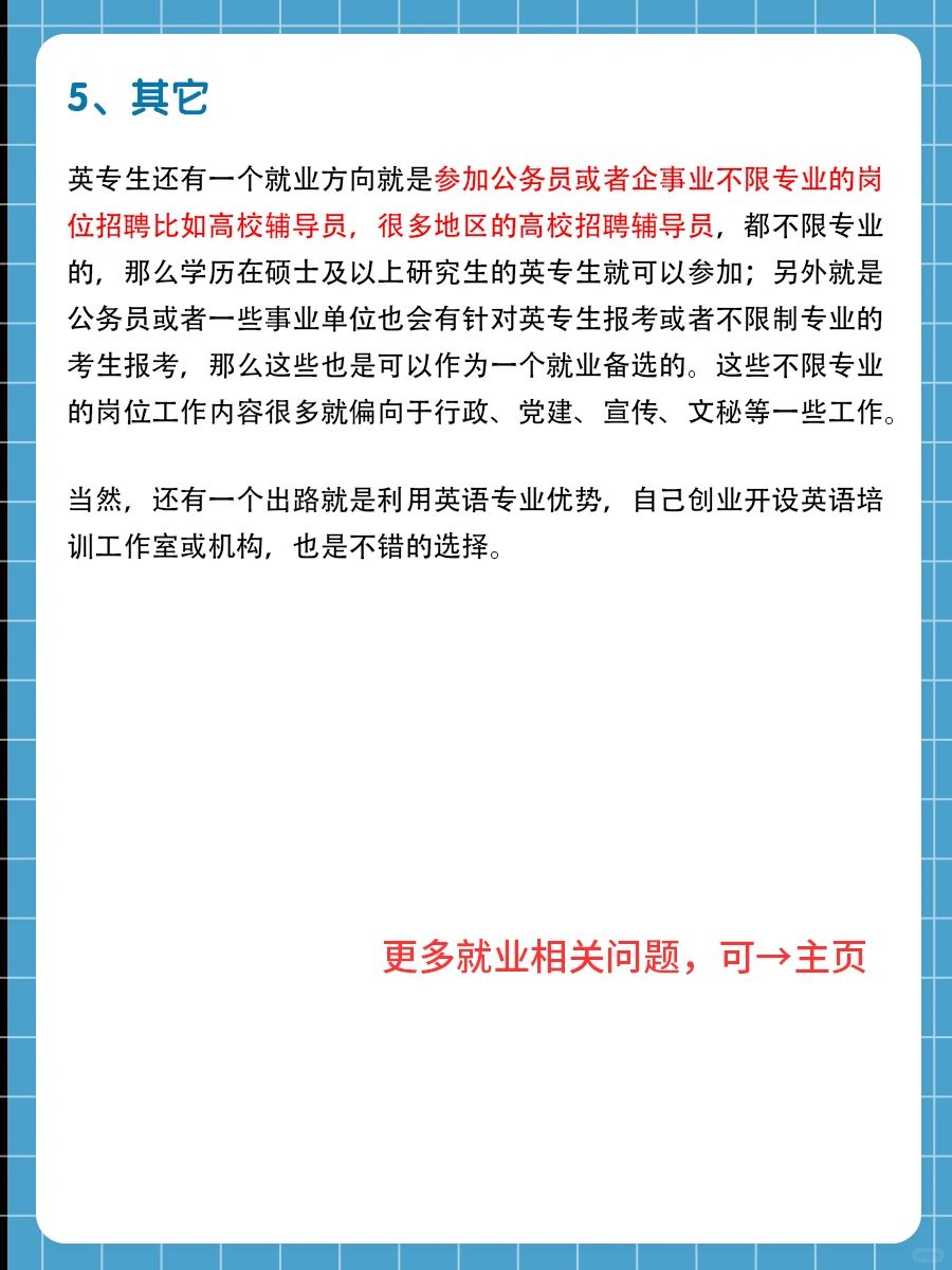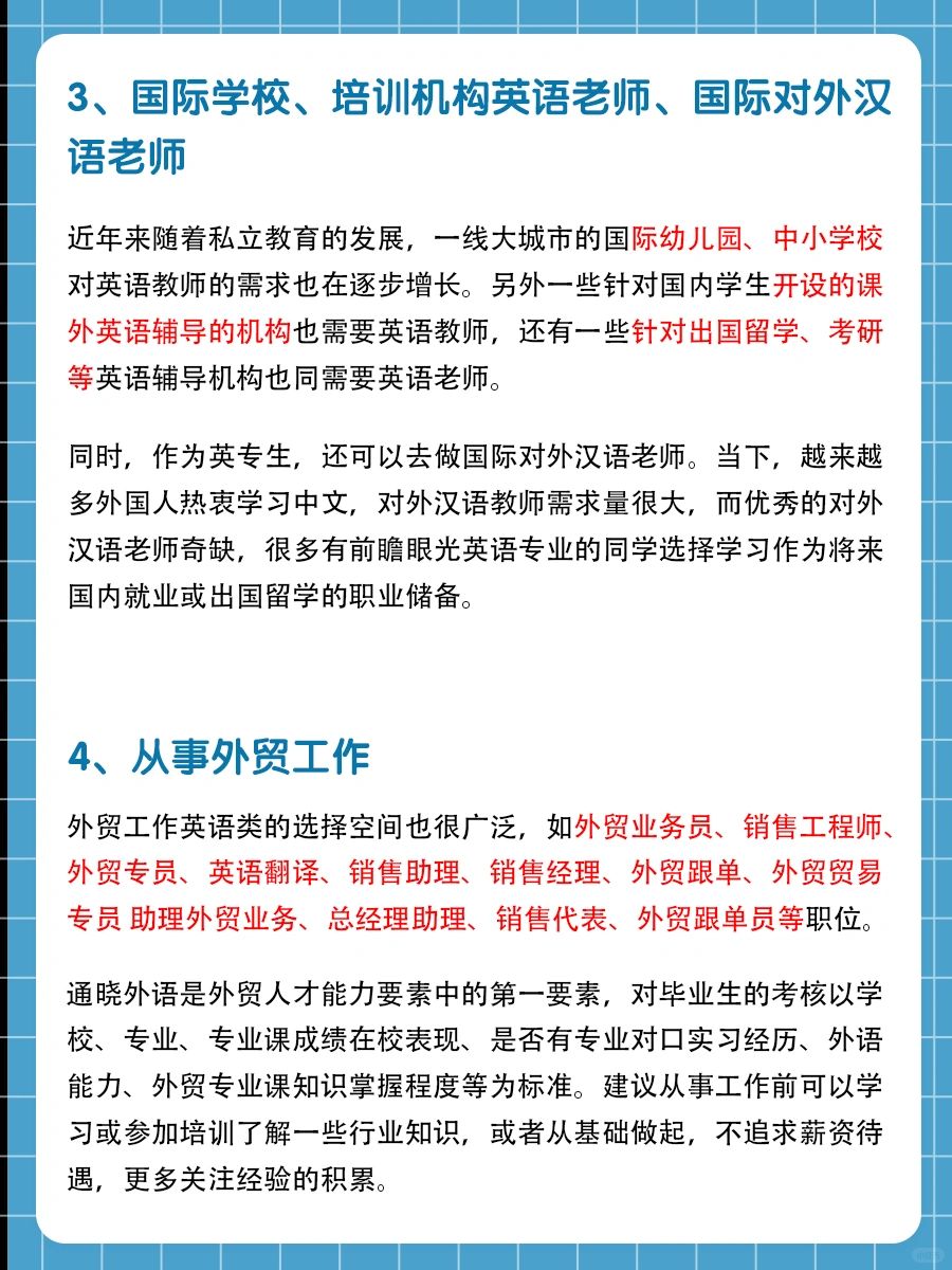 ❌最近两年的就业形势真的并不乐观 👉今日给小伙伴们整理一些相对来说好就业的方向 🔆为小伙伴们详细分析 1⃣翻译 2⃣高校、中小学英语教师 3⃣国际学校、培训机构英语老师、国际对外汉语老师 4⃣从事外贸工作 5⃣其它行业 👉还有其它就业方向欢迎评论区补充 🔔如果能够帮助到小伙伴们就赶紧收藏起来吧‼