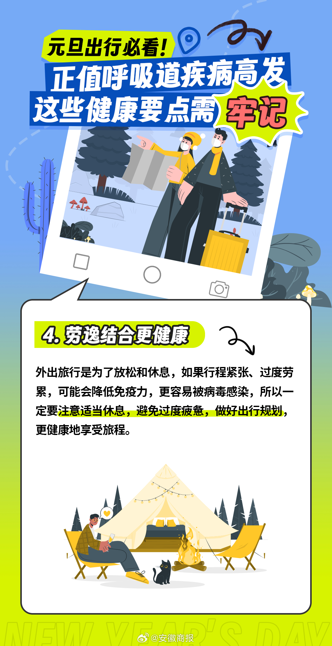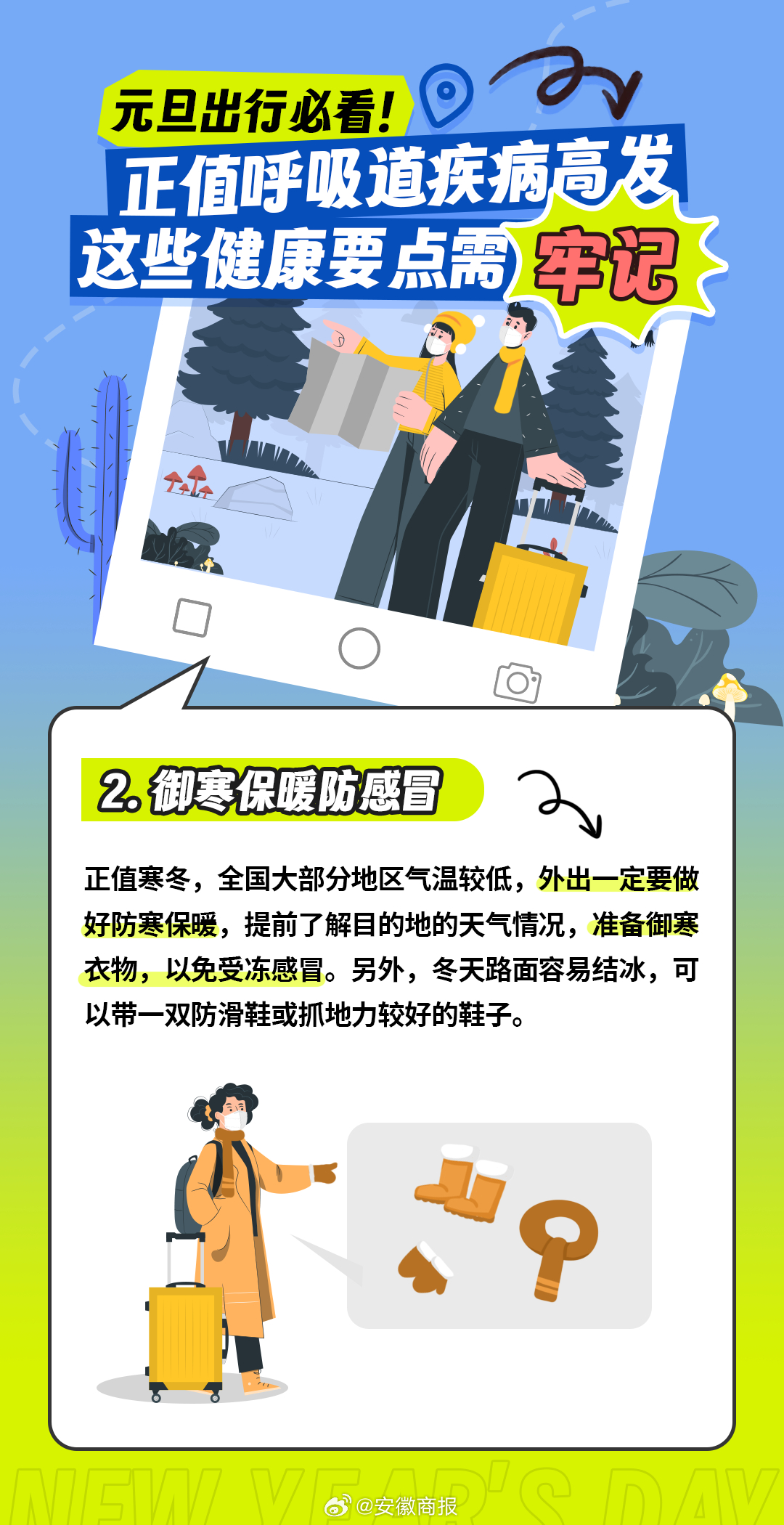 #2023年最后3天#【元旦假期需要知道的健康要点】你的元旦假期准备出行吗?不过此时正是呼吸道感染性疾病高发的季节,外出游玩的同时也要注意做好健康管理。为了防止旅途过程中感染患病,出现不适影响游玩状态,可以提前准备一些治疗药物,如对乙酰氨基酚等退热药、连花清瘟等感冒流感常用药等。#为什么这波流感这么厉害#