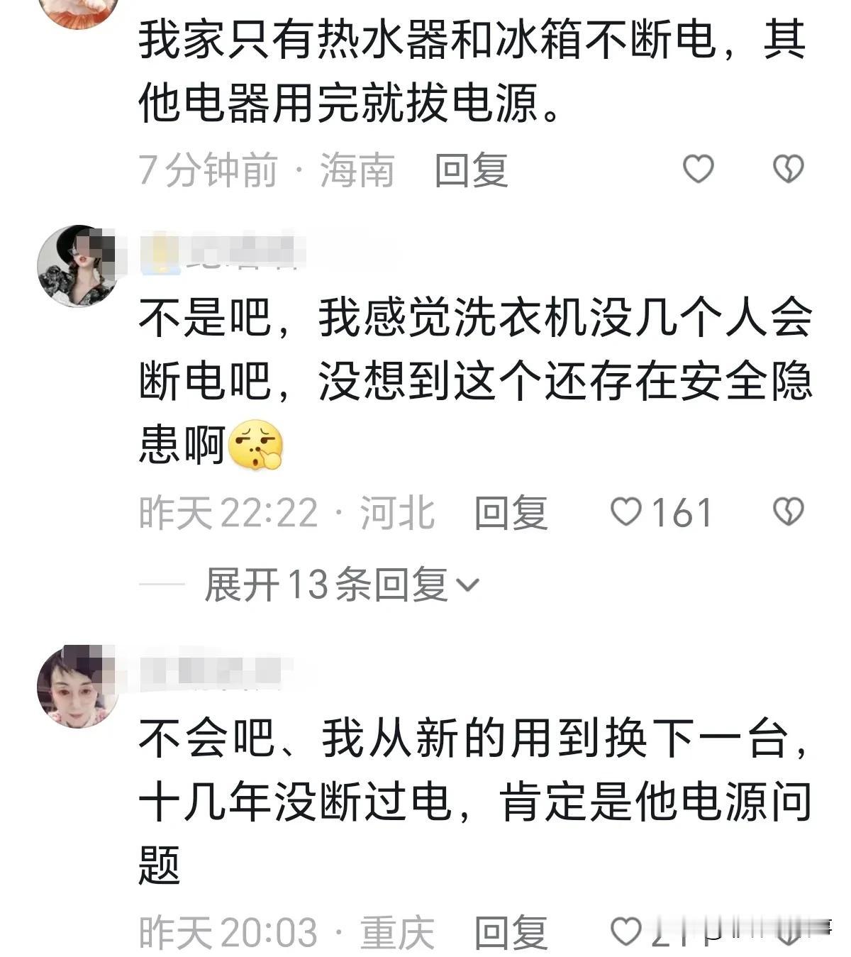 近日海南海口,一住户数日不在家,洗衣机未拔掉电源,导致洗衣机起火,万幸消防人员及时赶到扑灭火点,并未造成人员伤亡。 这件事让我想起,几年前半夜插排着火,正好起夜看见了,我上去一杯水给灭了,后来我妈说我虎,说你不知道要先拉闸断电么?然后用湿毛巾盖上去,你可真是命大啊!没被电死。 网友:不是吧!我感洗衣机没几个人会断电吧!没想到这个还存在安全隐患啊! 网友:不会吧,我10几年没断过电,肯定他电问题。