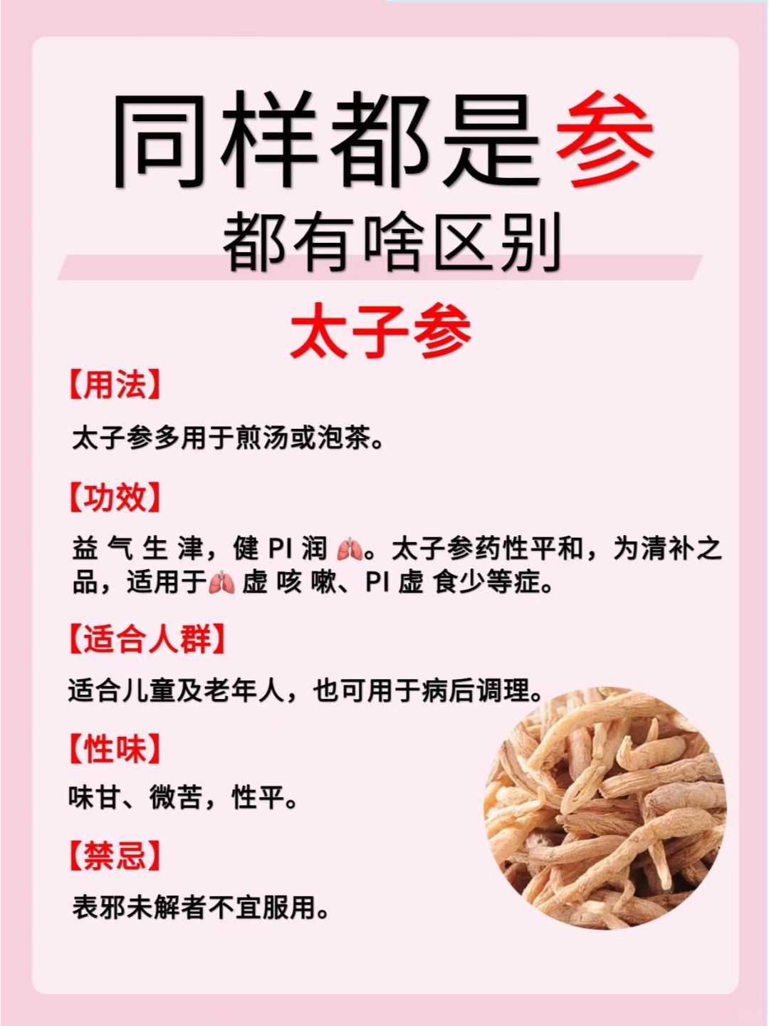 功效:益 气 生 津,健 PI 润 🫁。太子参药性平和,为清补之品,适用于🫁 虚 咳 嗽、PI 虚 食 少等症。