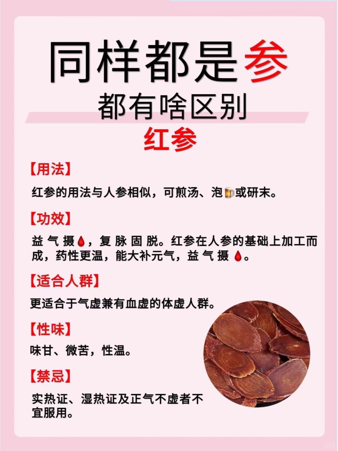 功效:益 气 摄 🩸,复 脉 固 脱。红参在人参的基础上加工而成,药性更温,能大补元气,益气摄🩸。