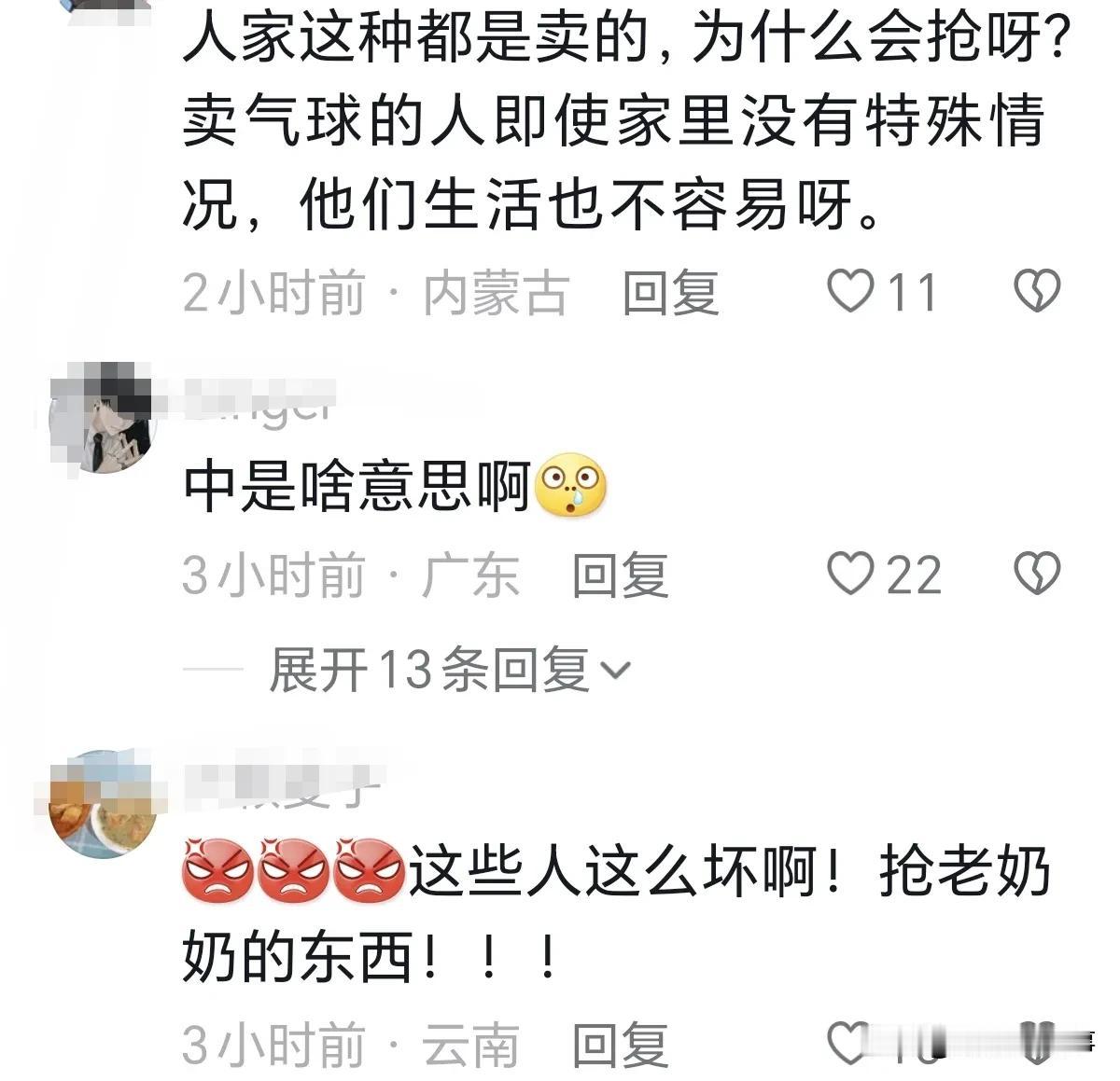 近日河南新乡,跨年时广场上老奶奶的气球被年轻人哄抢,老奶奶家中有癌症病人,所以卖气球补贴家用,没想到短短几十秒,手中一大把气球,会被年轻人哄抢的只剩一两个。 广场上年轻人们开心的欢呼庆祝着新年,老奶奶站在广场中央痛哭,好心大哥安慰转了100元,一位女士也不忍心上来给奶奶转钱。 网友:人家这种都是卖的,为什么抢呀? 网友:这些人这么坏啊!抢老奶奶的东西。