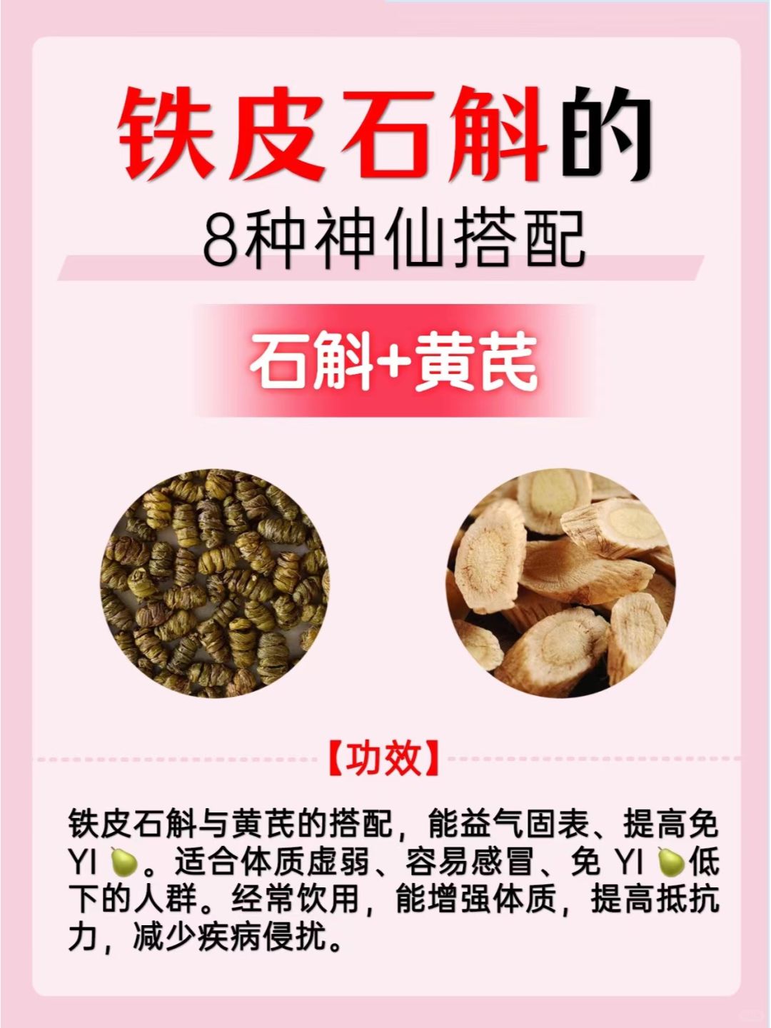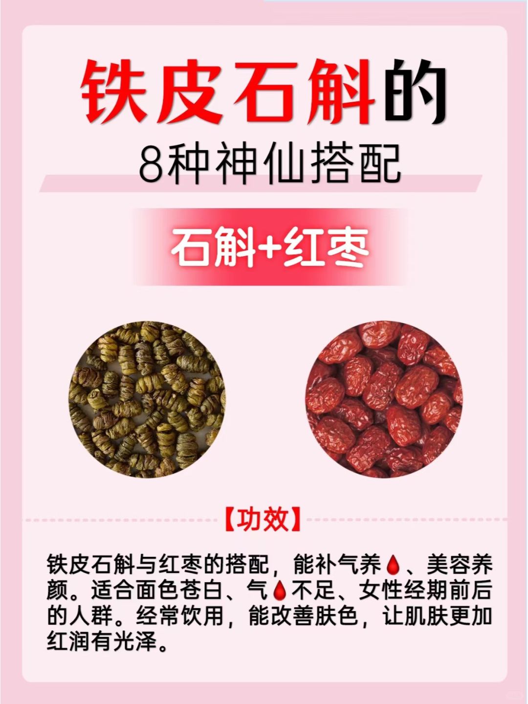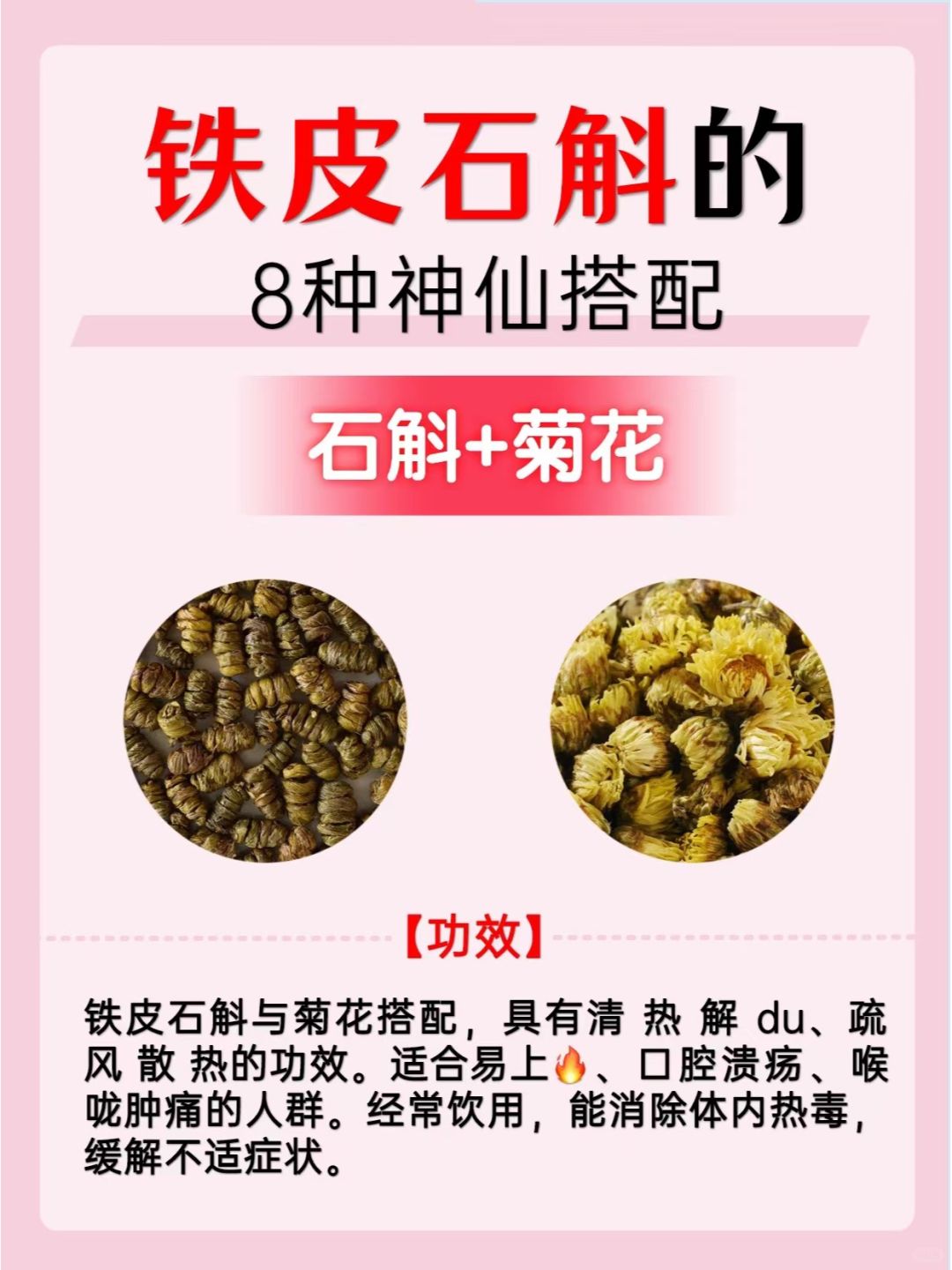 铁皮石斛,被誉为“中华九大仙草”之首,是历代皇室贵族的养生圣品。但是你知道吗?石斛的搭配也有讲究,不同的搭配能发挥出不同的养生效果。 4款养生茶+8种养生搭配,日常泡茶煮茶的时候就能喝,选一个适合自己的吧~ 每种搭配都有其独特的养生效果。如果你想尝试其他搭配或者有任何疑问,欢迎在评论区留言,我会尽快回复你的问题哦! 🌸今天的分享就到这里了,希望大家喜欢🌸 持续关🐷我,每天分享更多养生小知识哦~