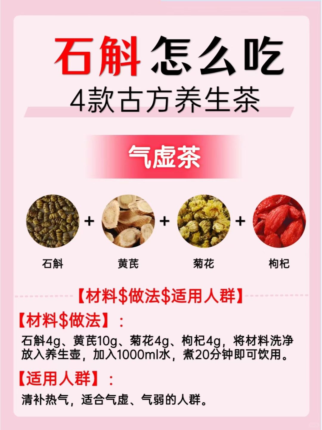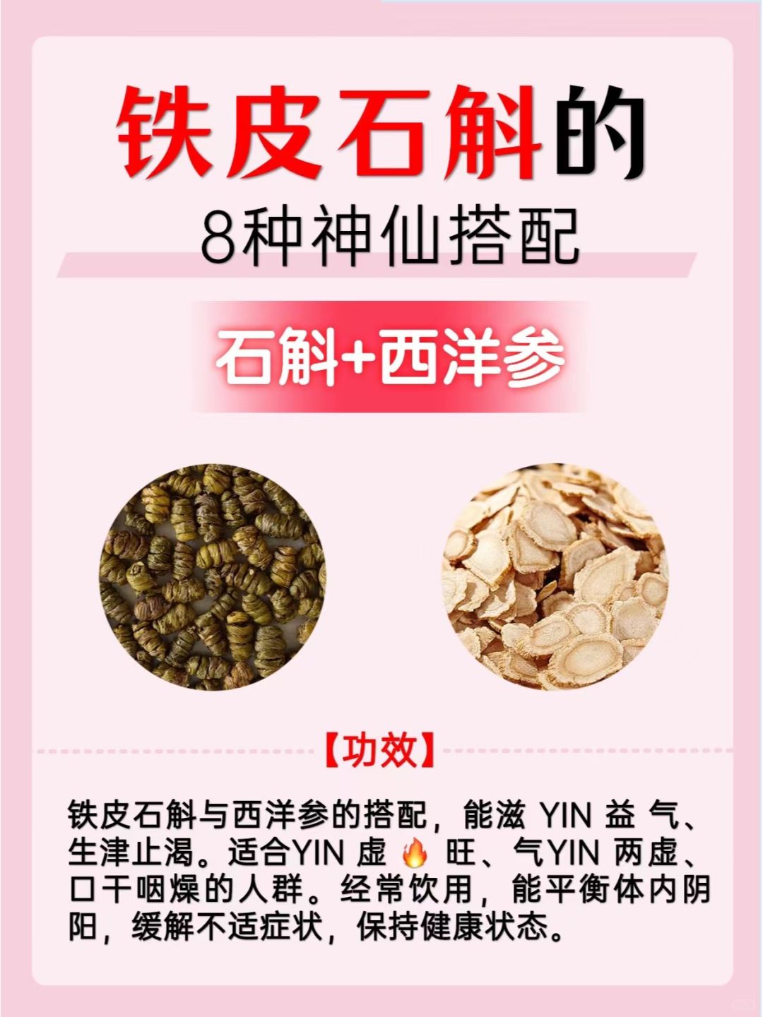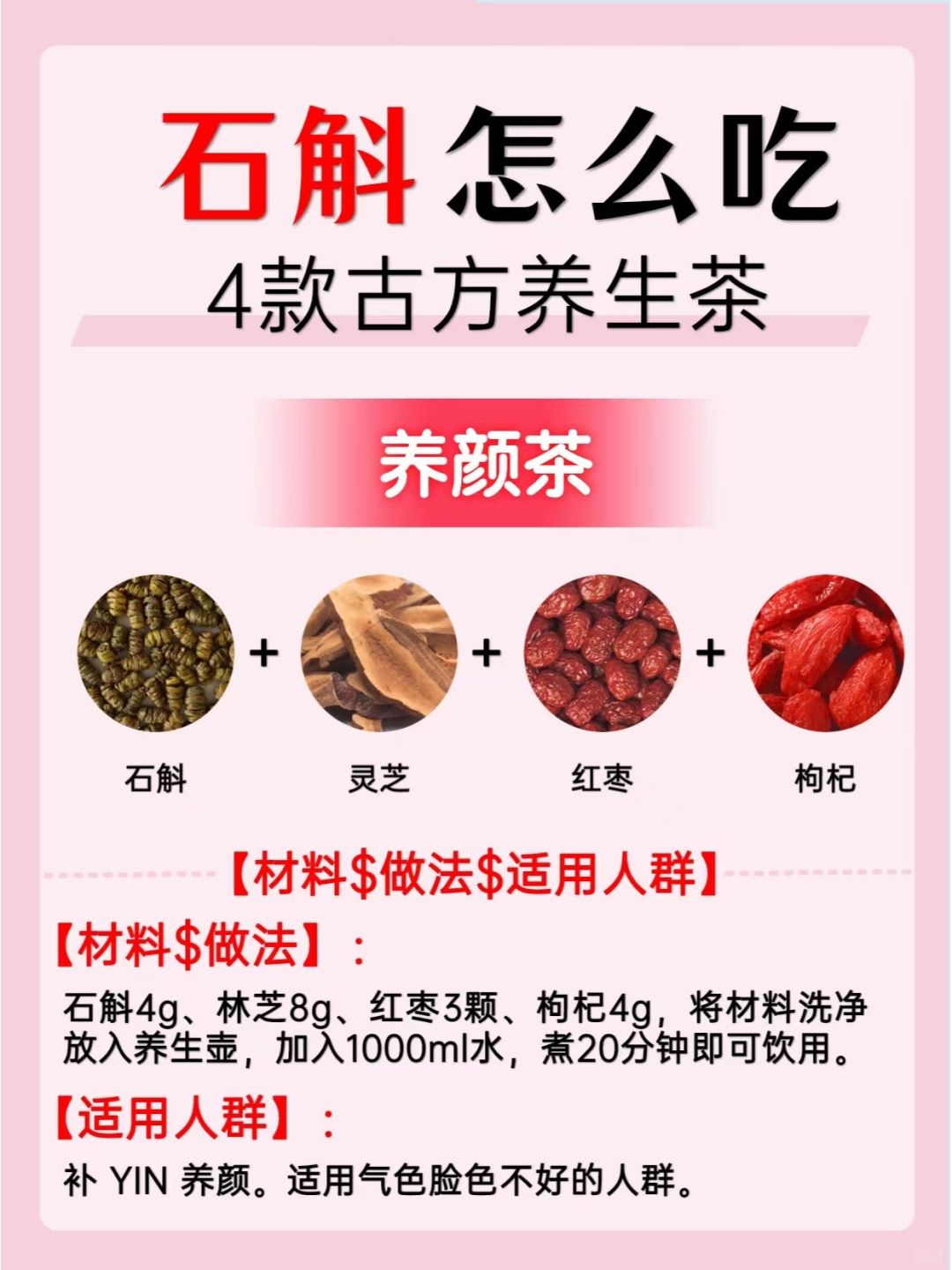 铁皮石斛,被誉为“中华九大仙草”之首,是历代皇室贵族的养生圣品。但是你知道吗?石斛的搭配也有讲究,不同的搭配能发挥出不同的养生效果。 4款养生茶+8种养生搭配,日常泡茶煮茶的时候就能喝,选一个适合自己的吧~ 每种搭配都有其独特的养生效果。如果你想尝试其他搭配或者有任何疑问,欢迎在评论区留言,我会尽快回复你的问题哦! 🌸今天的分享就到这里了,希望大家喜欢🌸 持续关🐷我,每天分享更多养生小知识哦~