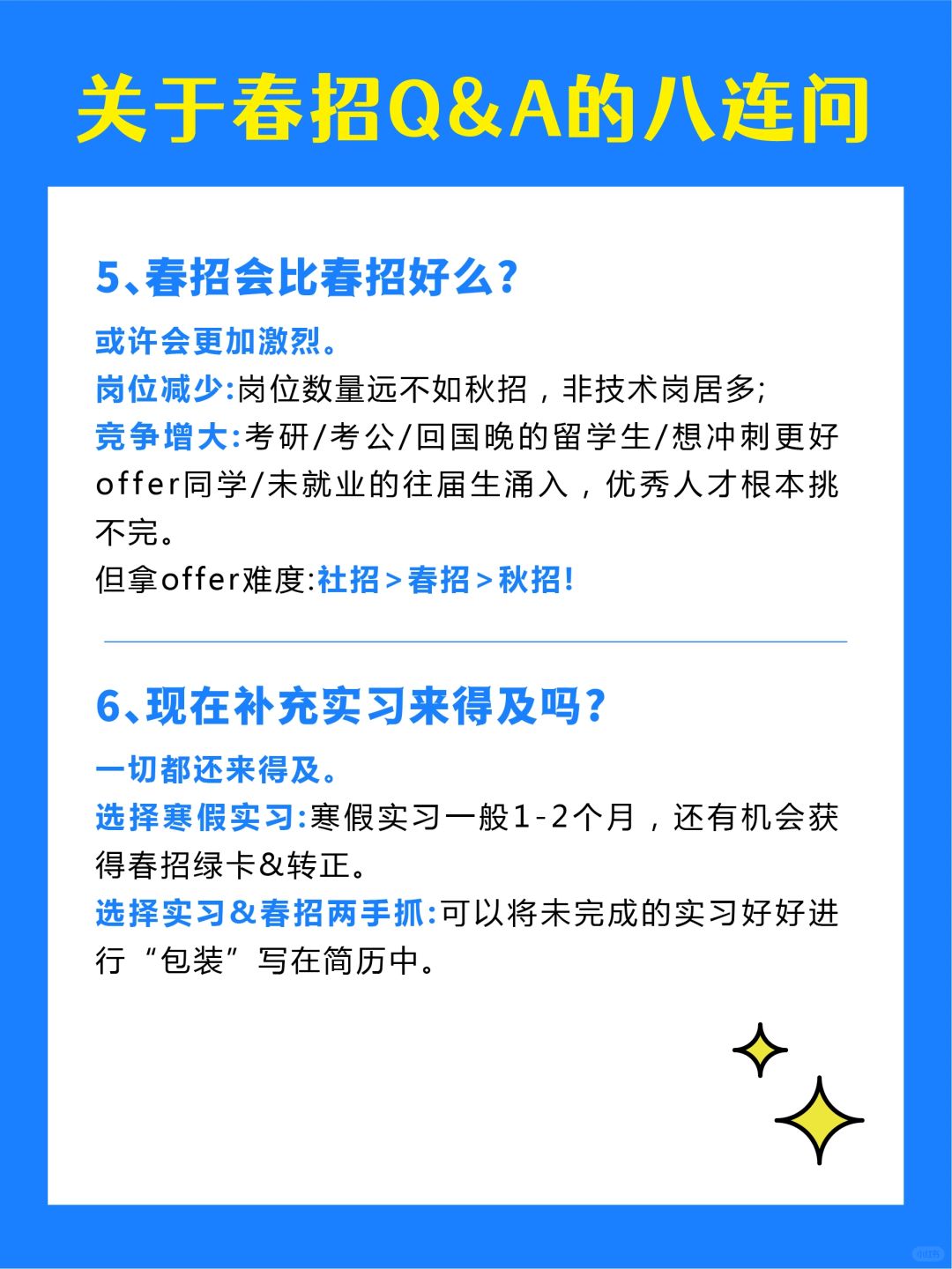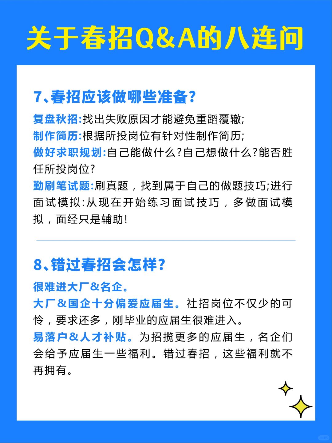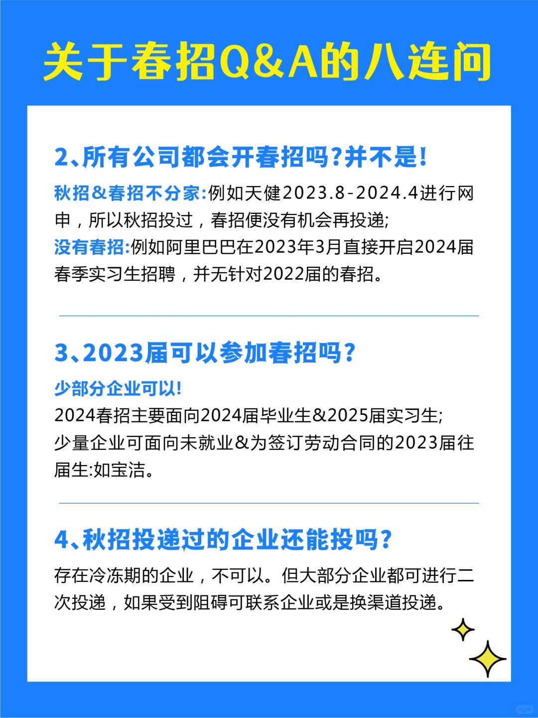 你开始投递了吗 ❓ 😵你可能不信,但春招已经开始了?一天一个信息差,可不要等到“金三银四”开始投递 🔔为防止春招大家走入误区,不妨说说关于春招那些大实话 ✅春招上岸难度并不比秋招低;✅有些企业并没有春招; ✅2023届往届生也可参加春招 …… ⚠最后还要提醒下大家,春招上岸速度非常快!祝大家都能早早拿到满意的offer,上岸成为优秀职场人! 👉具体的内容可以看图上部分,如果你也有求职需求,但是找不到合适的机会,可以戳我❗❗❗