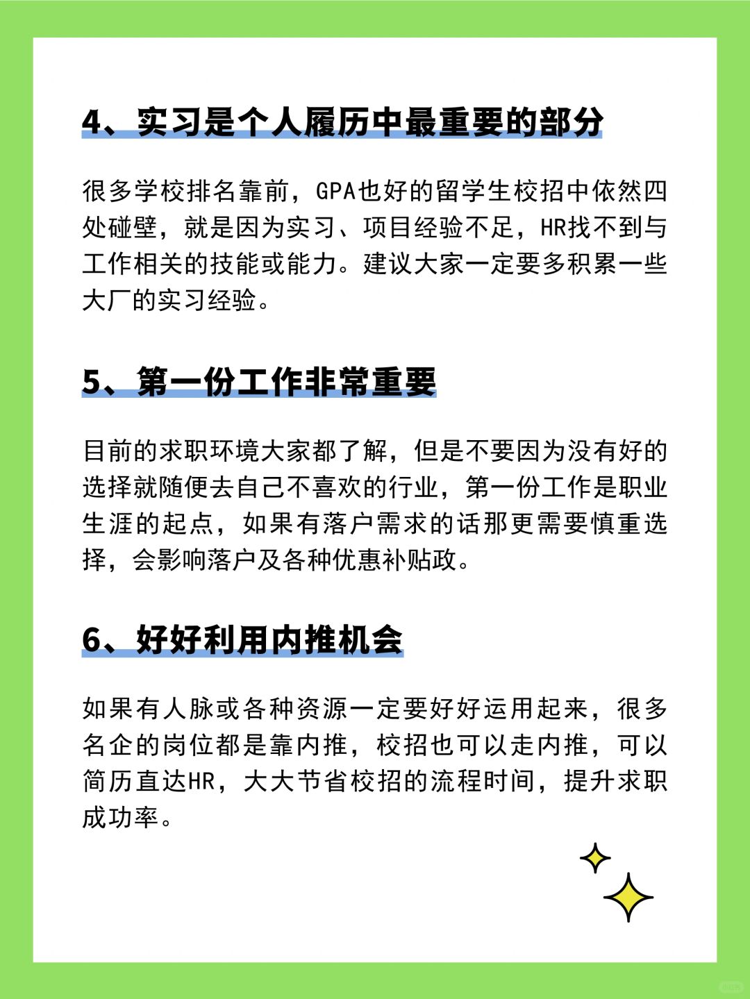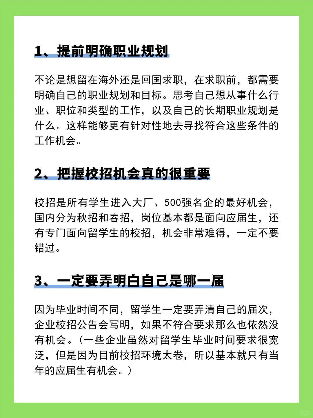 🌈今天打算给回国求职的留学生几点建议,希望能帮助到大家 1⃣提前明确职业规划 2⃣把握校招机会很重要 3⃣一定要弄明白自己是哪一届 4⃣实习是个人履历中最重要的一部分 5⃣第一份工作很重要 6⃣好好利用内推机会 💌如果你对校招流程不了解,不知道怎么丰富实习经历,对求职迷茫,可以戳戳职场大O!助力每一位留学生好就业!