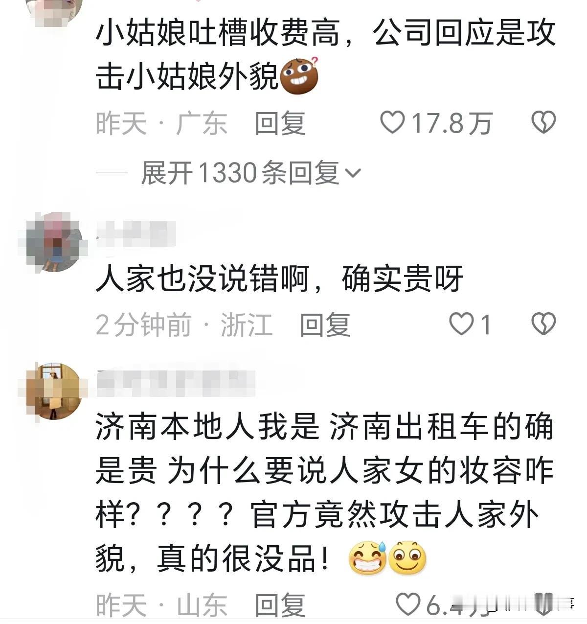 女大学生吐槽济南出租车比网约车价格贵一半,网约车40元出租车80元,以后再也不会坐出租车了,她吐槽后好多出租车司机去学校找女孩。 出租车公司工作人员:你看看她的妆容,你看看她的语言,她的态度,她是在反映问题么?她是在做噱头,她是在攻击诽谤,计价器收费标准是正常的。 网友:我是济南本地人,出租车确实贵,为什么要攻击女孩妆容咋样?真的很没品。