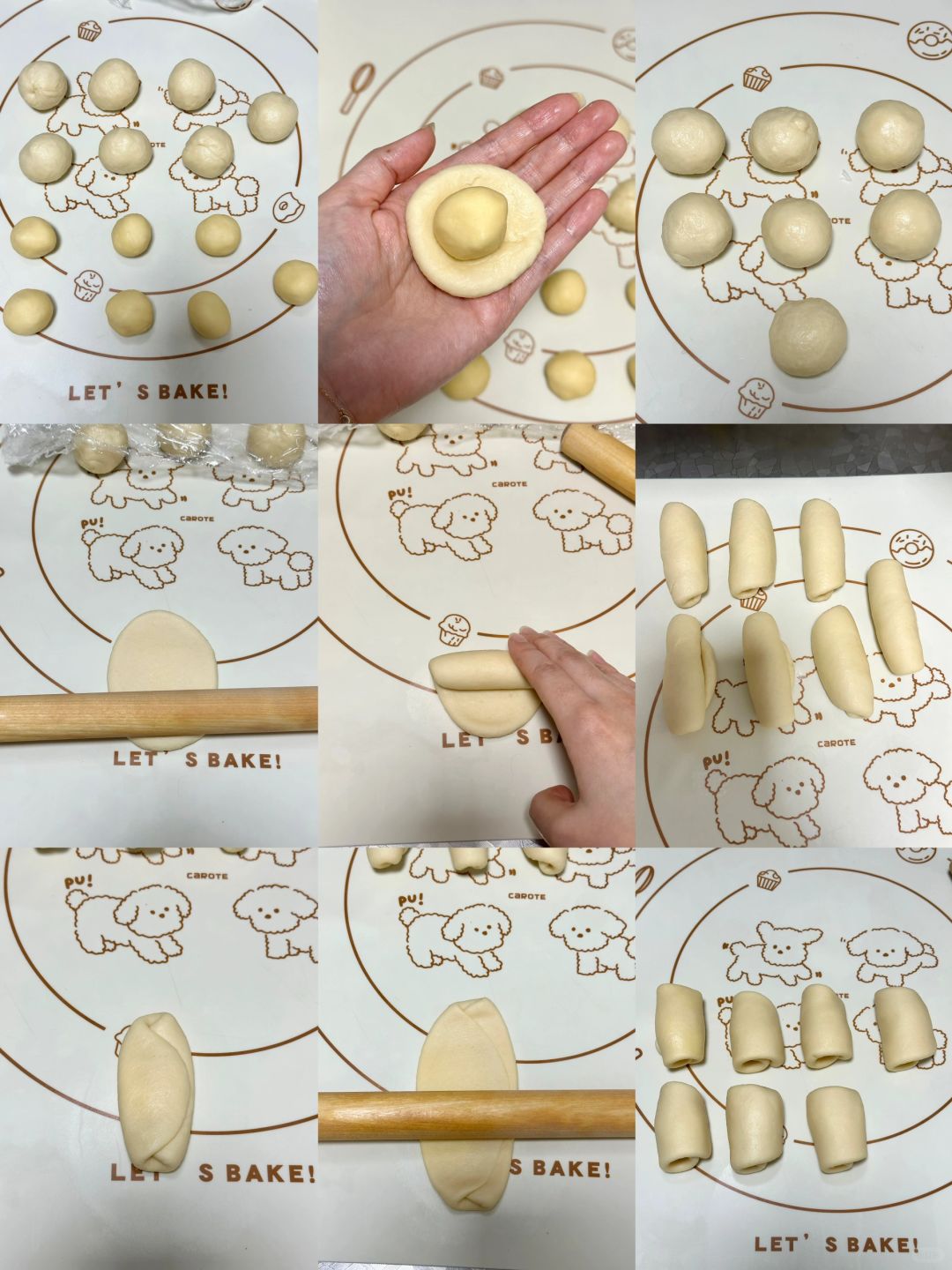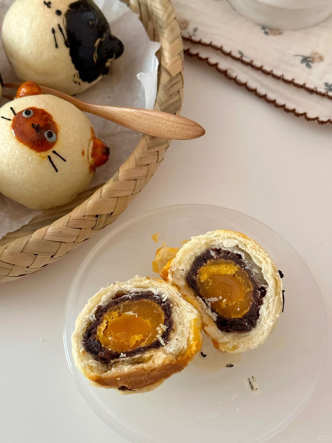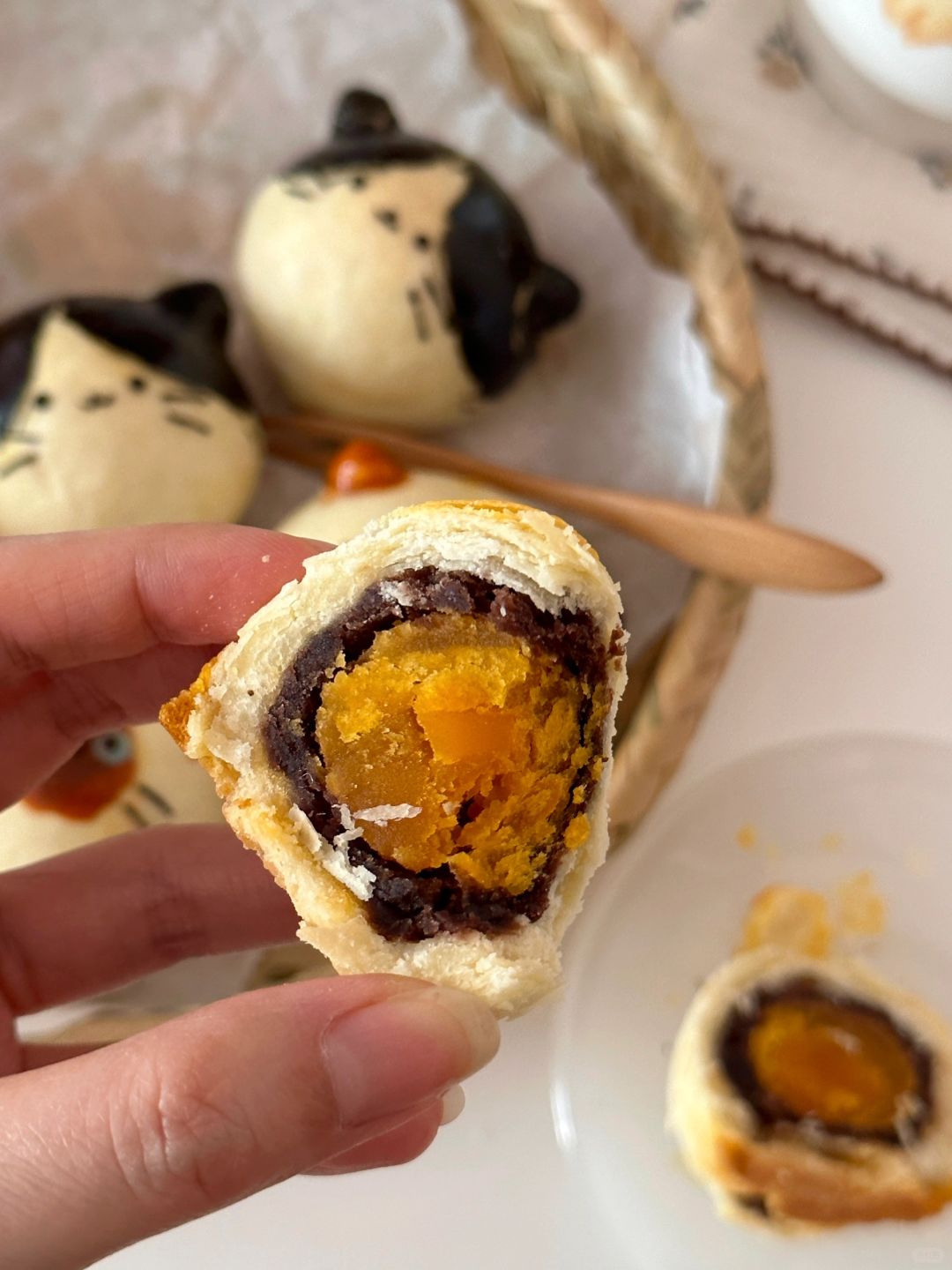 ⑤如图示包出蛋黄酥。剩下的油皮制作小猫耳朵,涂些水粘合更牢固