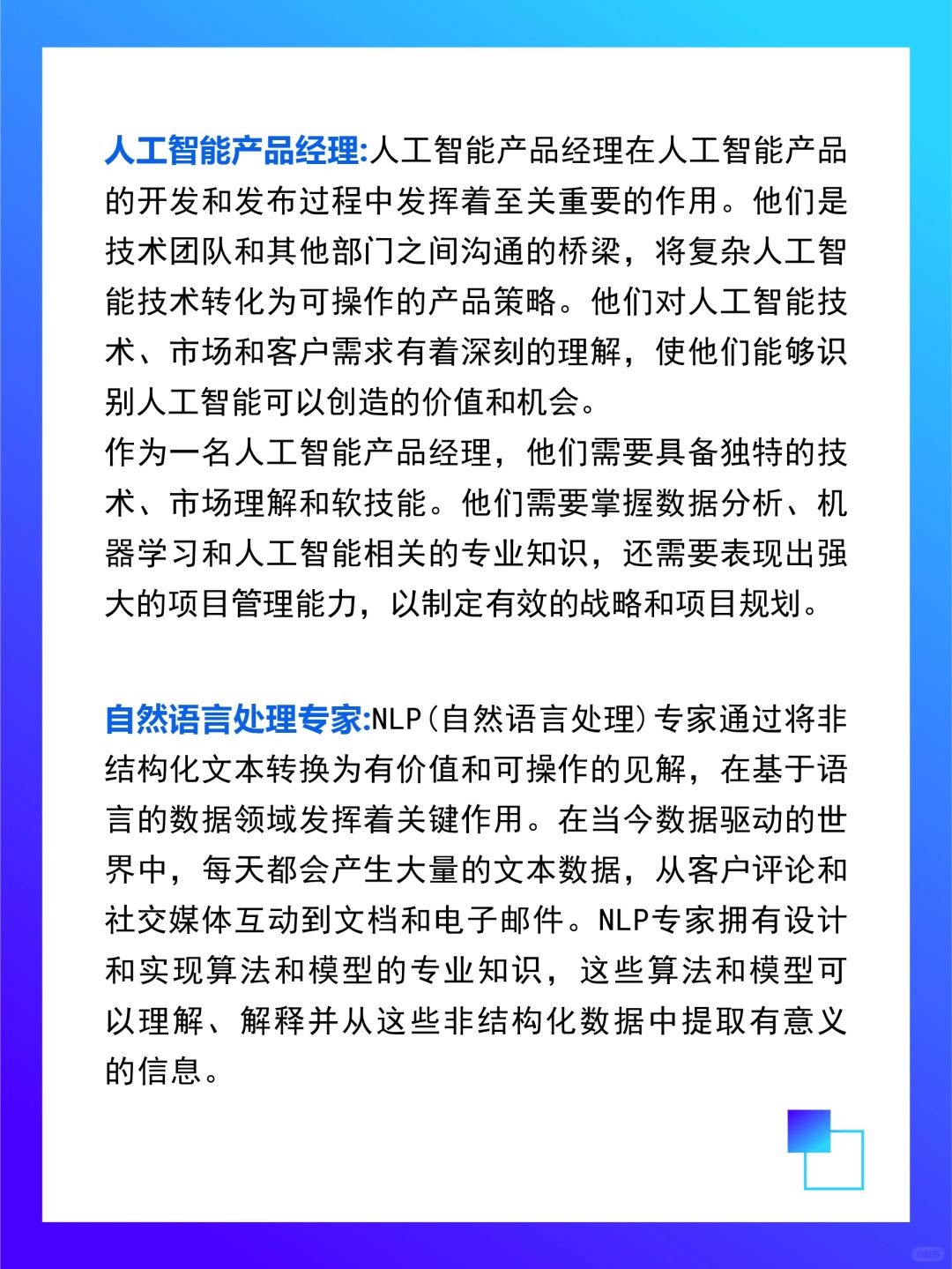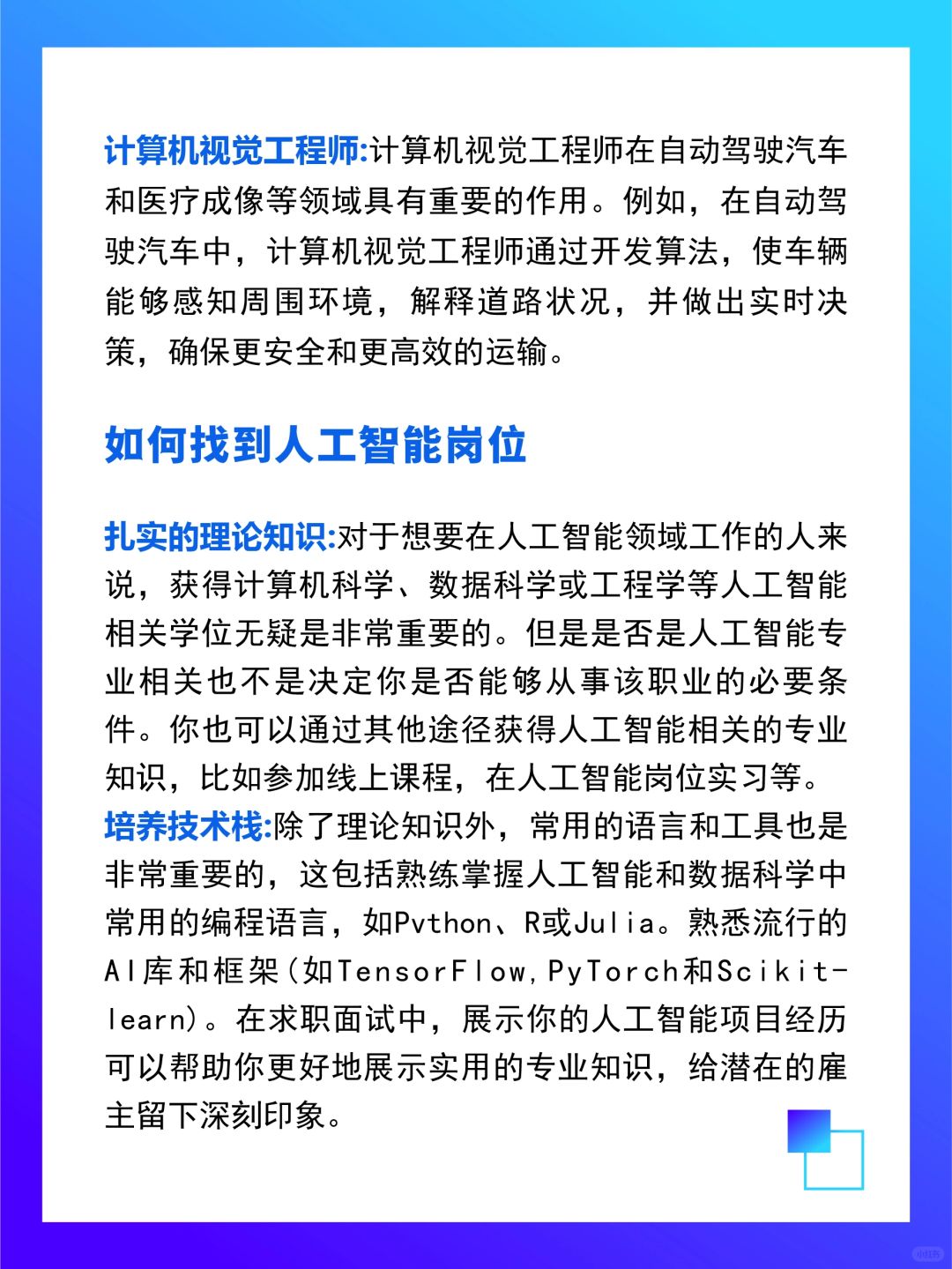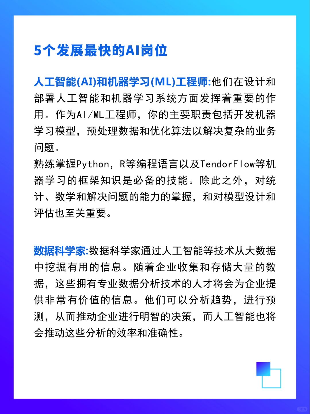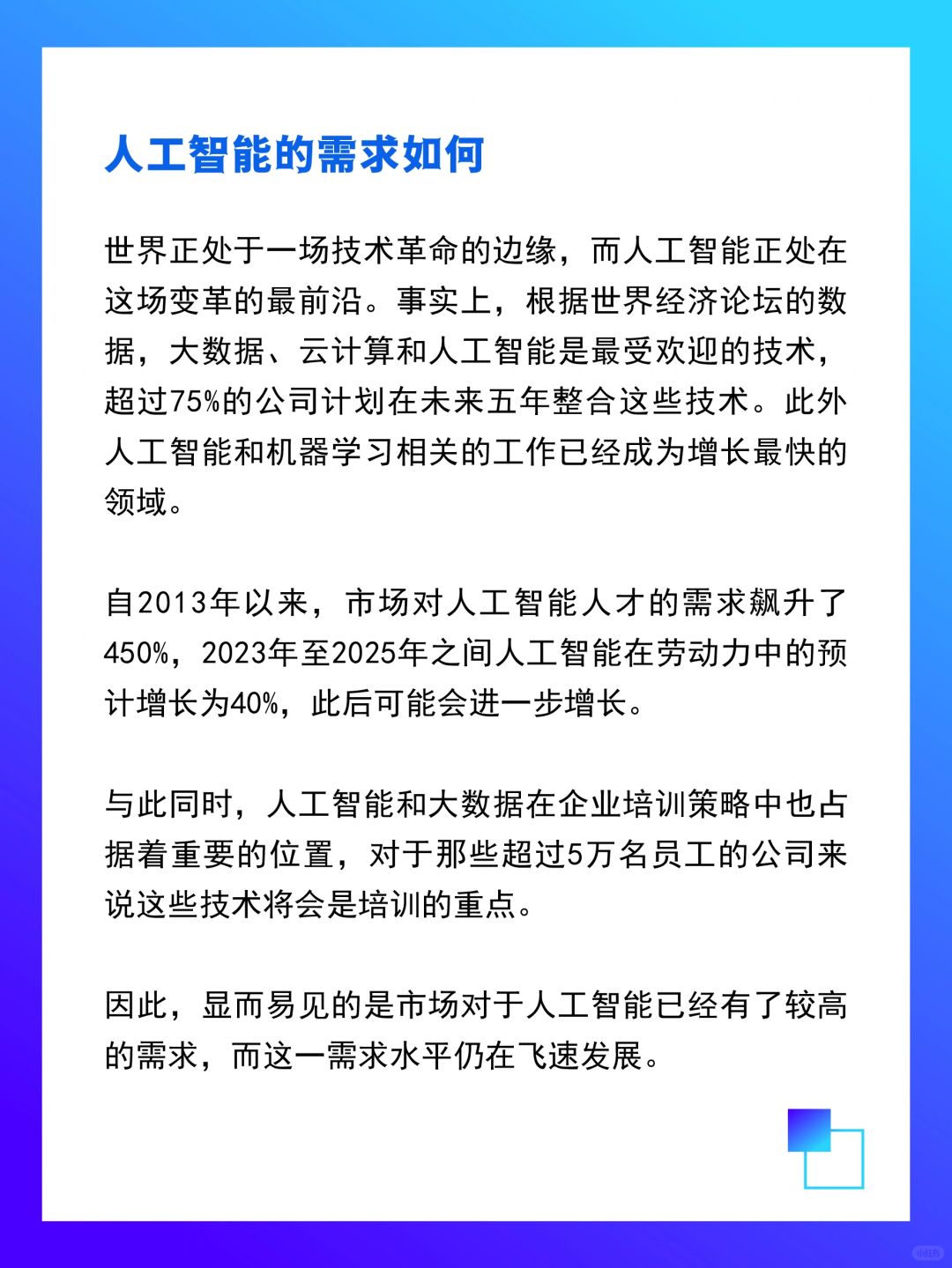💎AI(人工智能)近年来经历了快速发展,在过去的一段时间内重塑了许多行业,随着人工智能的普及,对人工智能专业人才的需求也不断增多。不管你是经验丰富的人工智能领域专家,还是人工智能爱好者,这都是你职场发展的黄金机遇。 ✅想要从事人工智能或者正在此行业的小伙伴们,赶紧码住啦希望可以帮助到你们❗