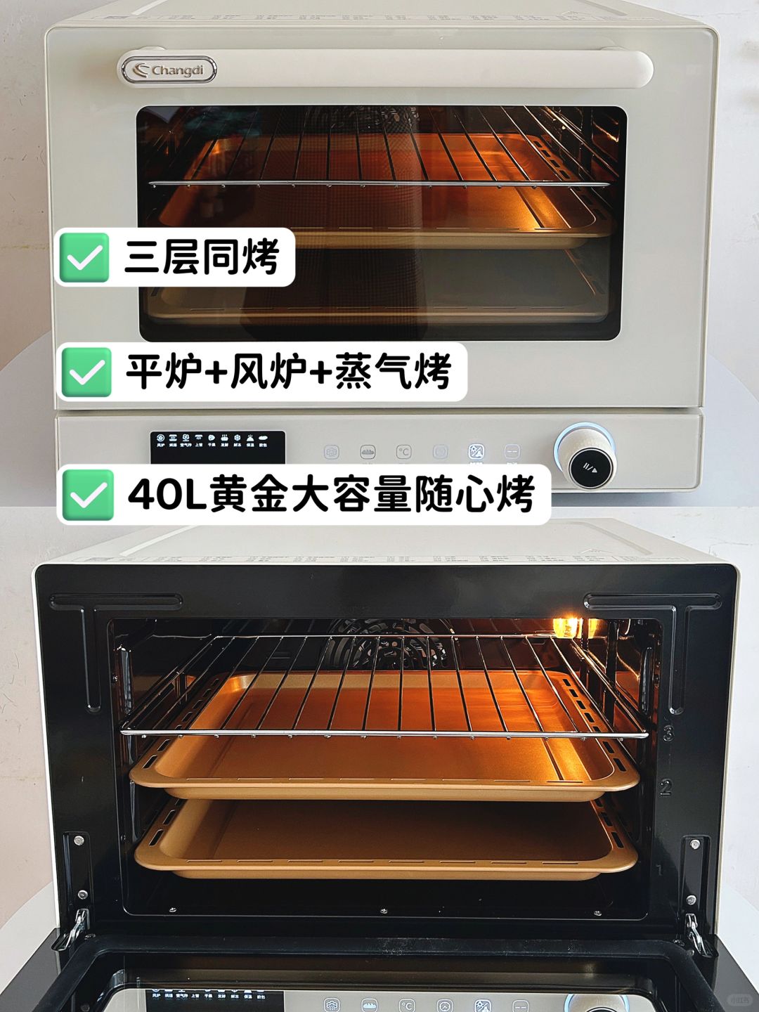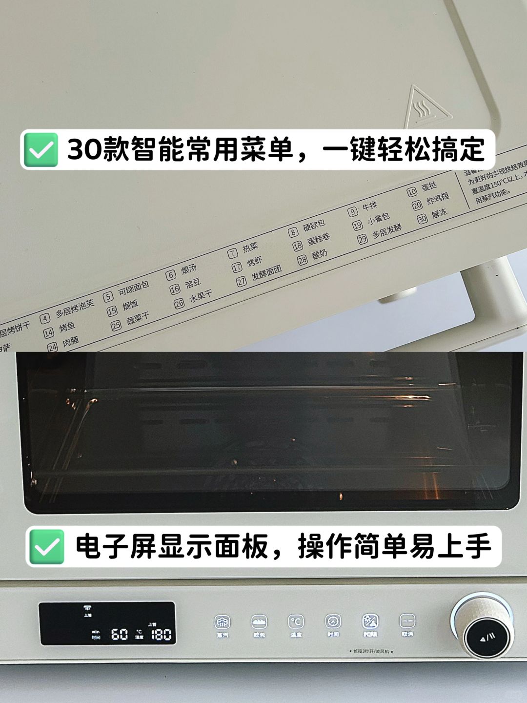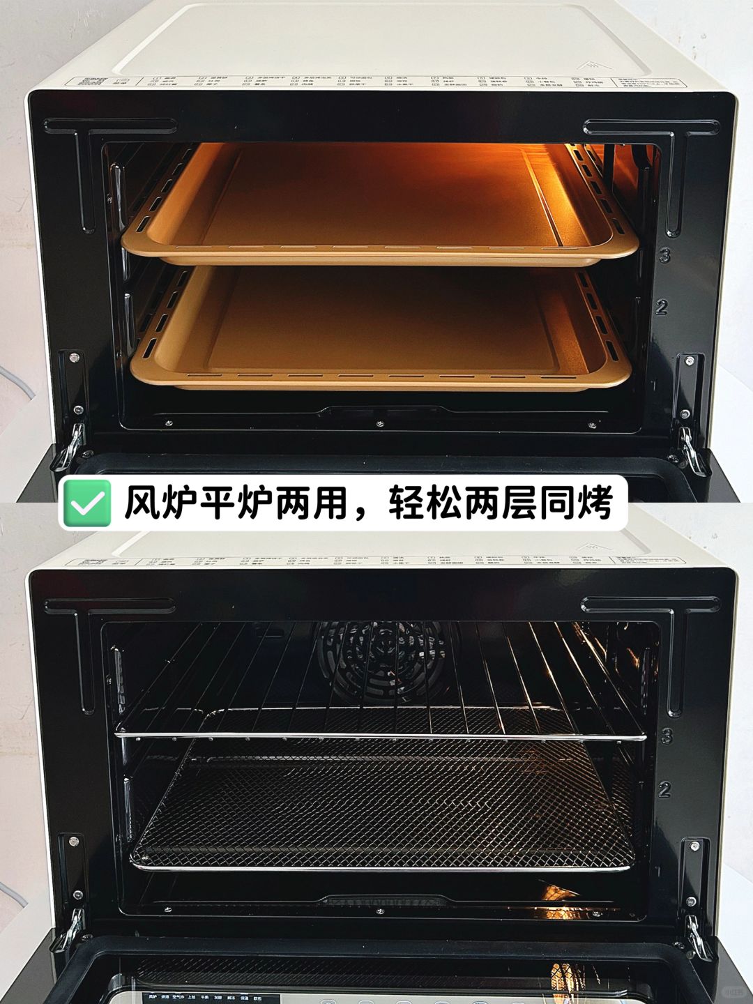终于拥有这款多功能高颜值的烤箱了,收到就迫不及待开箱了,今天来做个开箱测评,一起来看看吧! 1⃣外观:烤箱主机身是奶白色的,奶fufu的,颜值没得说,简约大气又百搭 2⃣容量:40L容量,能多层同烤,可以同时烤2个6寸戚风,2个8寸披萨,38个蛋黄酥,38个月饼,吐司4个,鸡翅38个等,在风炉模式下,可以轻松两层同烤,甚至可以三层烤饼干 2⃣功能:风炉、平炉、蒸汽烤三合一,独立操作,自由切换,一度一调节,有空炸,干果,发酵,解冻,保温等功能,还带有30款智能常用菜单,多层烤饼干、多层烤泡芙、多层发酵,还有煨汤、冷饭菜加热、硬欧包、软欧包;蛋黄酥、可颂、蛋糕卷、小餐包等功能,一键自动烤等,这简直是太完美了。 3⃣风炉模式:背部大风机+光波管热气循环(快速升温),平炉模式:上下两根发热管,独立控温 4⃣蒸汽功能: 一键欧包和一键蒸汽功能,烤箱侧下方配有隐藏水箱,容量200毫升,按下"一键蒸汽"15s左右即可出汽(欧包酥脆的表皮功劳就在于蒸汽,高温蒸汽使面团表皮淀粉糊化,形成酥脆表皮;蒸汽也能帮助面团充分膨胀) 5⃣操作面板:旋钮按钮+触控按键设计。通过旋转旋钮来调节菜单、功能、温度、时间等设置,易操作 6⃣配件:2个金色烤盘➕1个烤网➕1个菱形烤网➕1个接渣盘➕1个隔热手柄 同款烤箱的姐妹们,咱们一起用它解锁烘焙食谱吧!