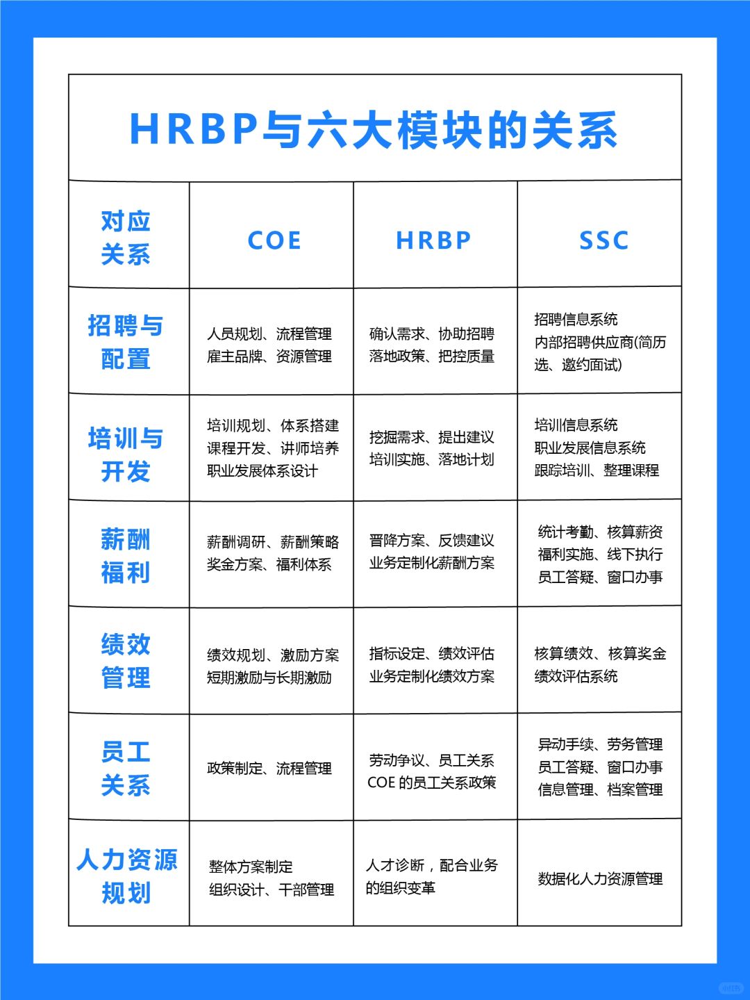 六大模块通常是多对一的服务模式,业务部门需要对接招聘、培训、薪酬等多个人力资源部门