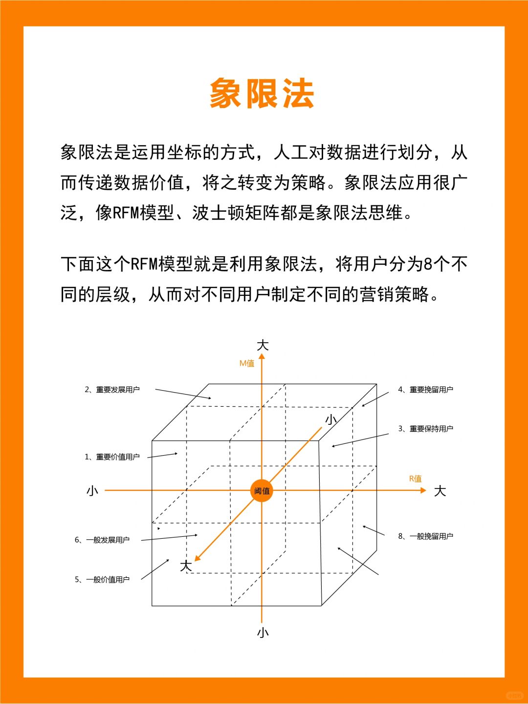 RFM模型就是利用象限法,将用户分为8个不同的层级,从而对不同用户制定不同的营销策略