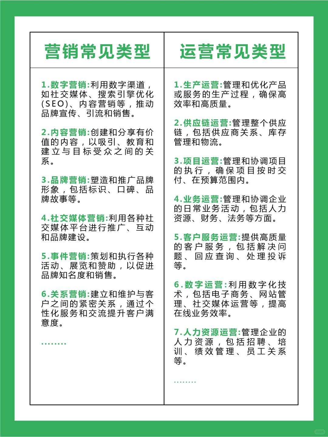 运营常见的类型:生产运营、供应链运营、项目运营、业务运营、客户服务运营、数字运营、人力资源运营等。