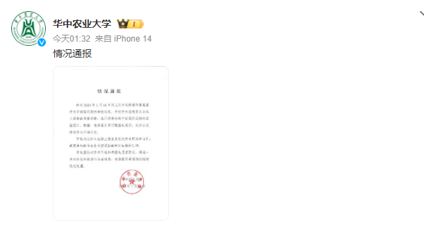 前两天华中农业大学十一名学生联名举报教授黄某某学术不端、压迫学生的调查结果终于出来了。华中农业大学在今天凌晨发布通报,黄某某存在学术不端的行为,已经暂停其所有教学活动。这次举报的成功可以说是一次历史性的胜利,之前也不乏学生举报导师的情况发生,但大多是大事化小、小事化了。这次十一人联名举报,加上互联网的发酵,希望华中农大能严肃处理!.