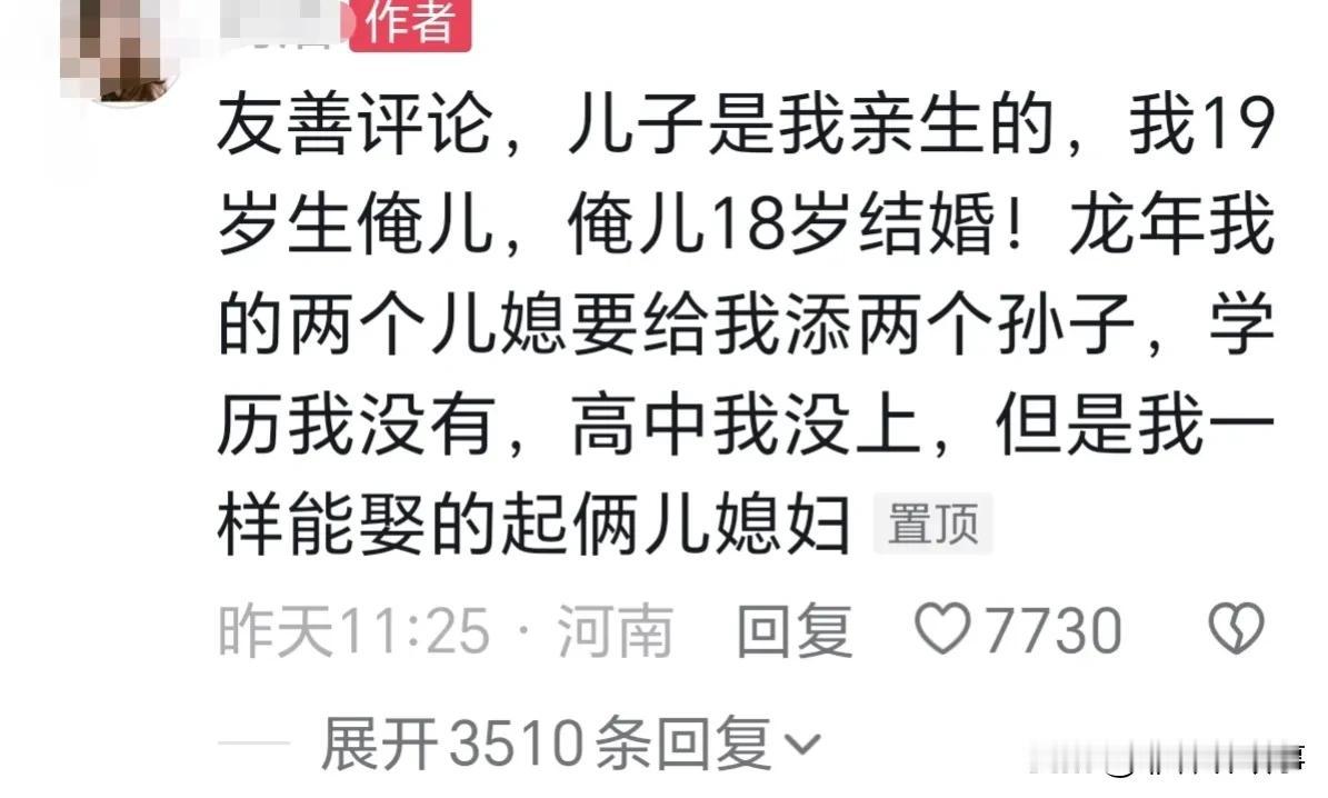 37岁就当上了喜婆婆,女子称自己虽然没有学历,但是一样娶的起俩儿媳妇,龙年还会有两个孙子,她19岁生儿子,儿子18岁结婚。 网友:80后真是神奇的一代人,有的人当公公婆婆,有的人孩子还在上幼儿园,有的人至今单身未婚未育,你是哪种?