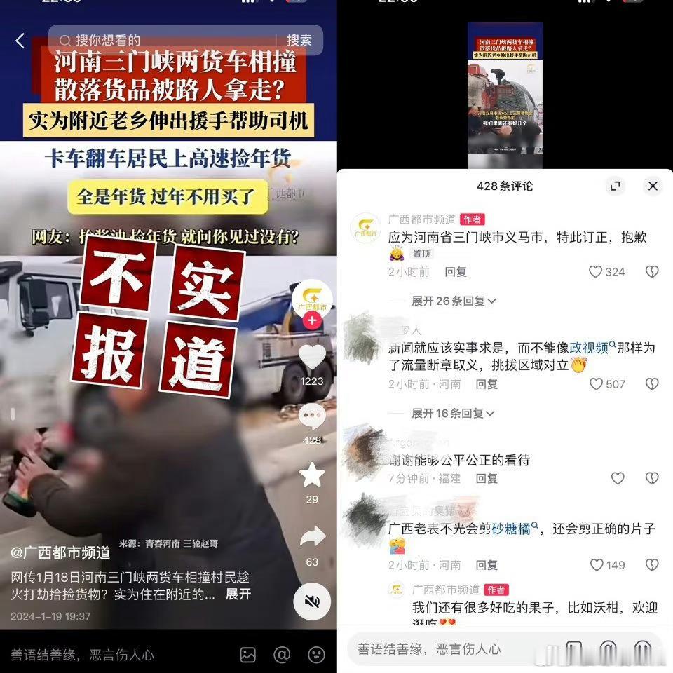 【#三门峡高速货车侧翻众人哄抢物品系谣言#司机家属:没有被哄抢,好心人连口水都没喝】1月18日上午,三门峡渑池新310国道天池镇路段,一辆货车因侧翻,货品散落在地,后有媒体截取群众搬物品的部分视频称司机货品遭捡拾。