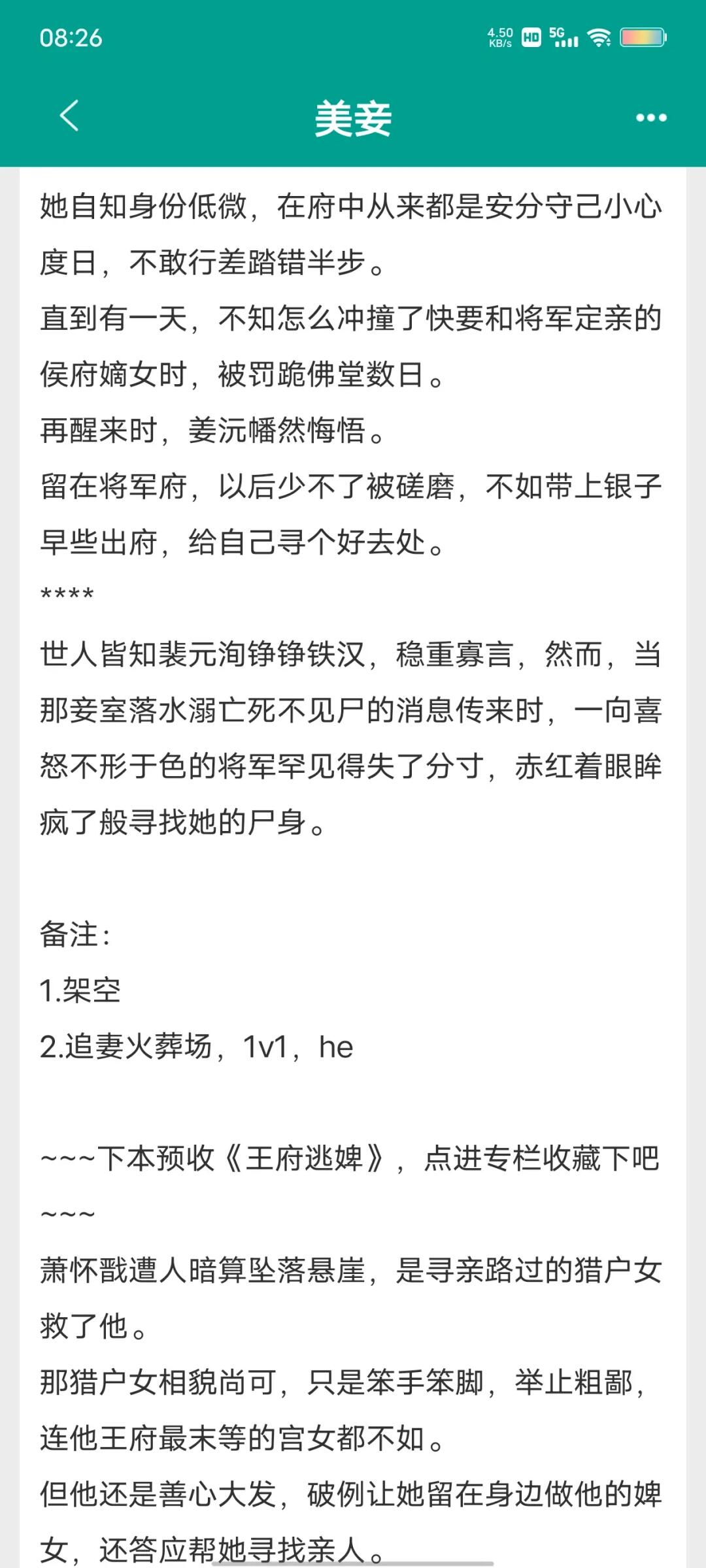 《美妾》by叶信言 刚完结的新文,一共88章 古早死遁带球跑,很套路的文 将军男主vs大夫女主 女主死遁,后男主追妻,不怎么虐男主 1v1 结局he,还是想吐槽为什么女主被男主伤害(生理或心理)死遁后都选择把孩子生下来,印象中只看过一两本流掉的,改天推一下。