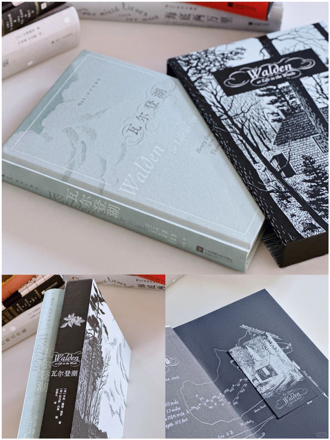 🌿其中的《瓦尔登湖》是有硬壳函套的精装版。清新淡雅的湖蓝底色配上木屋树林的碳描勾画,整一个梭罗的宁静世外桃源风。