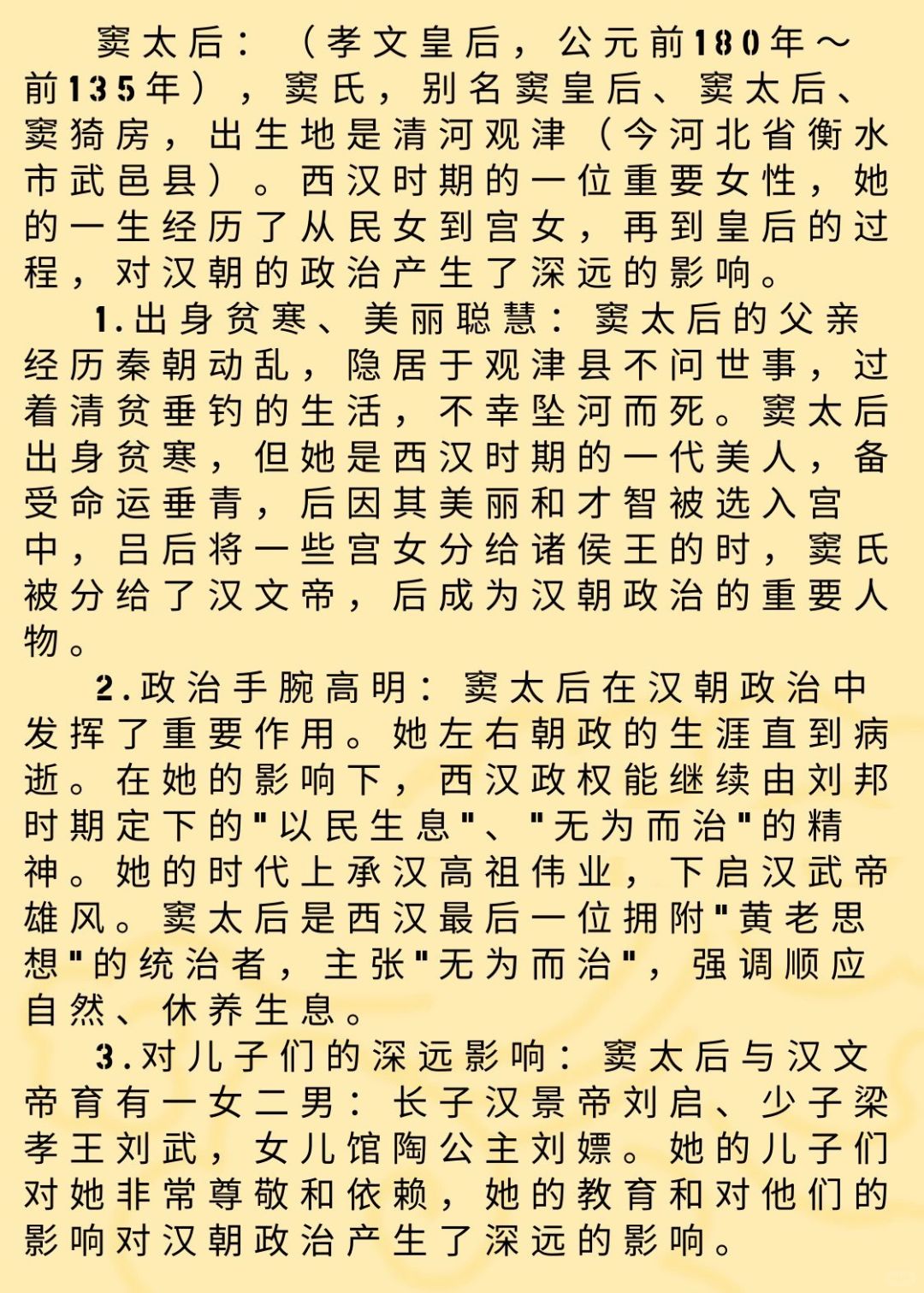 ⭐️窦太后:(孝文皇后,公元前180年~前135年),窦氏,别名窦皇后、窦太后、窦猗房,出生地是清河观津(今河北省衡水市武邑县)。西汉时期的一位重要女性,她的一生经历了从民女到宫女,再到皇后的过程,对汉朝的政治产生了深远的影响。