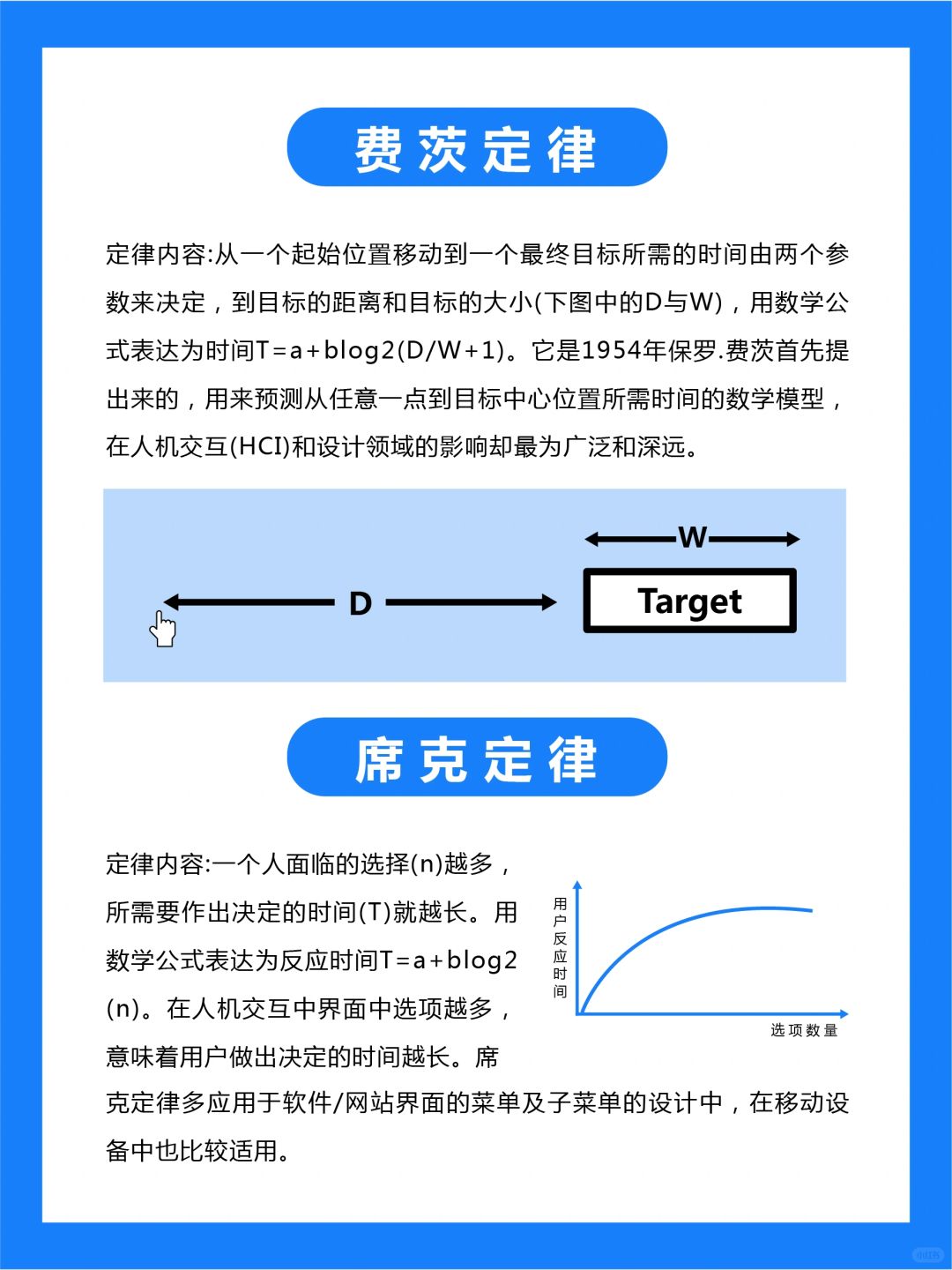 定律内容:一个人面临的选择(n)越多,所需要作出决定的时间(T)就越长。用数学公式表达为反应时间T=a+blog2(n)。在人机交互中界面中选项越多,意味着用户做出决定的时间越长。