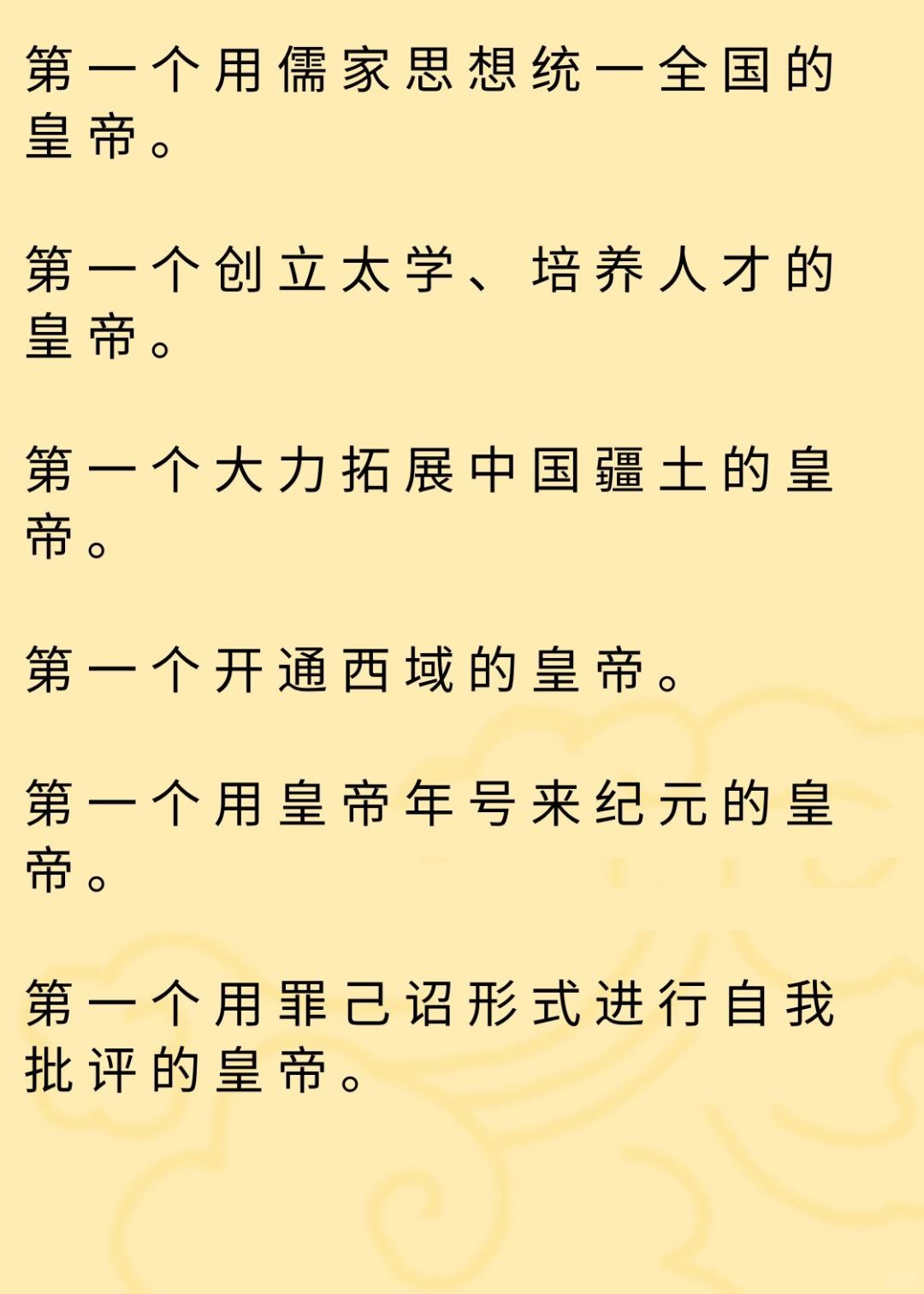 汉武帝建立了一个国家前所未有的尊严,给了一个族群挺立千秋的自信,他的国号成了一个伟大民族永远的名字。他首创了六个第一: 第一个用儒家思想统一全国的皇帝。 第一个创立太学、培养人才的皇帝。 第一个大力拓展中国疆土的皇帝。 第一个开通西域的皇帝。 第一个用皇帝年号来纪元的皇帝。 第一个用罪己诏形式进行自我批评的皇帝。