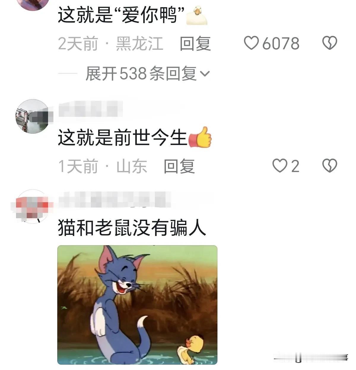 一只小鸭子爱上了一只流浪猫,流浪猫走到哪,小鸭子追到哪,为了流浪猫小鸭子也不和鸭群在一起玩了,小鸭子甚至为了流浪猫和别的小猫咪打架,有好吃的只给流浪猫一只猫吃,它就在旁边守着,流浪猫睡觉的时候,它也会在一旁保护流浪猫。 网友:这就是传说中的爱你鸭。 网友:猫和老鼠没有骗人。