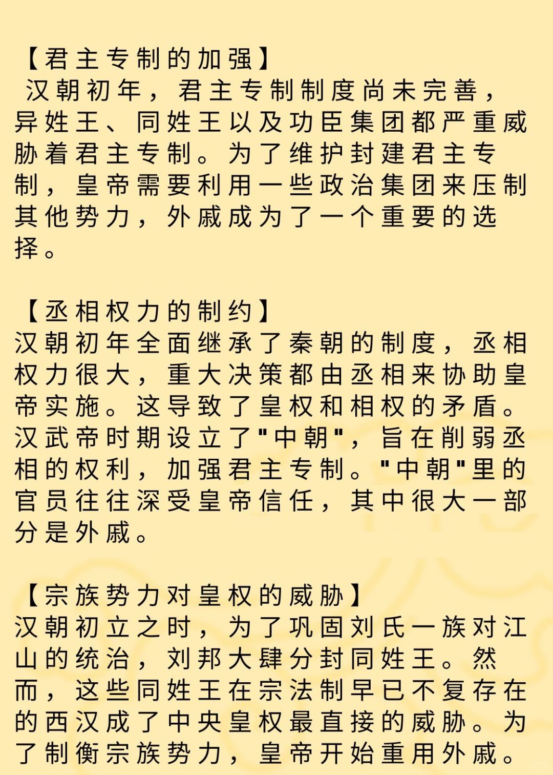 丞相权力的制约:汉朝初年全面继承了秦朝的制度,丞相权力很大,重大决策都由丞相来协助皇帝实施。这导致了皇权和相权的矛盾。汉武帝时期设立了“中朝”,旨在削弱丞相的权利,加强君主专制。“中朝”里的官员往往深受皇帝信任,其中很大一部分是外戚。