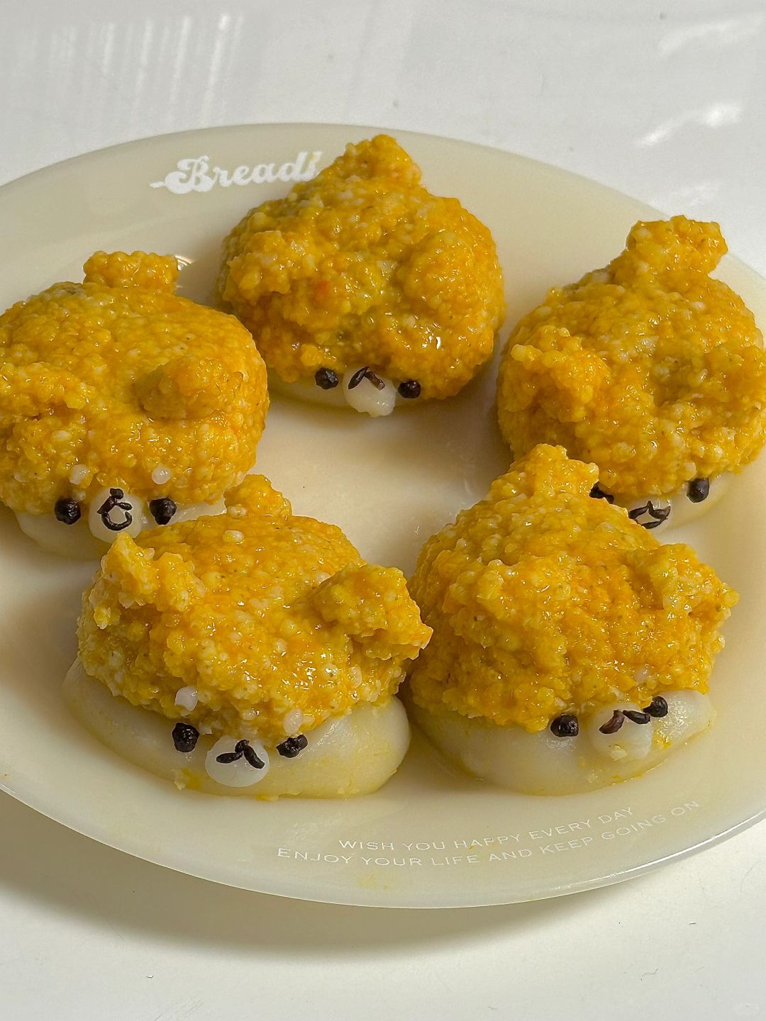 4.黄米部分包好提前泡软的葡萄干,和糯米团部分组装,做出表情刷上蜂蜜水