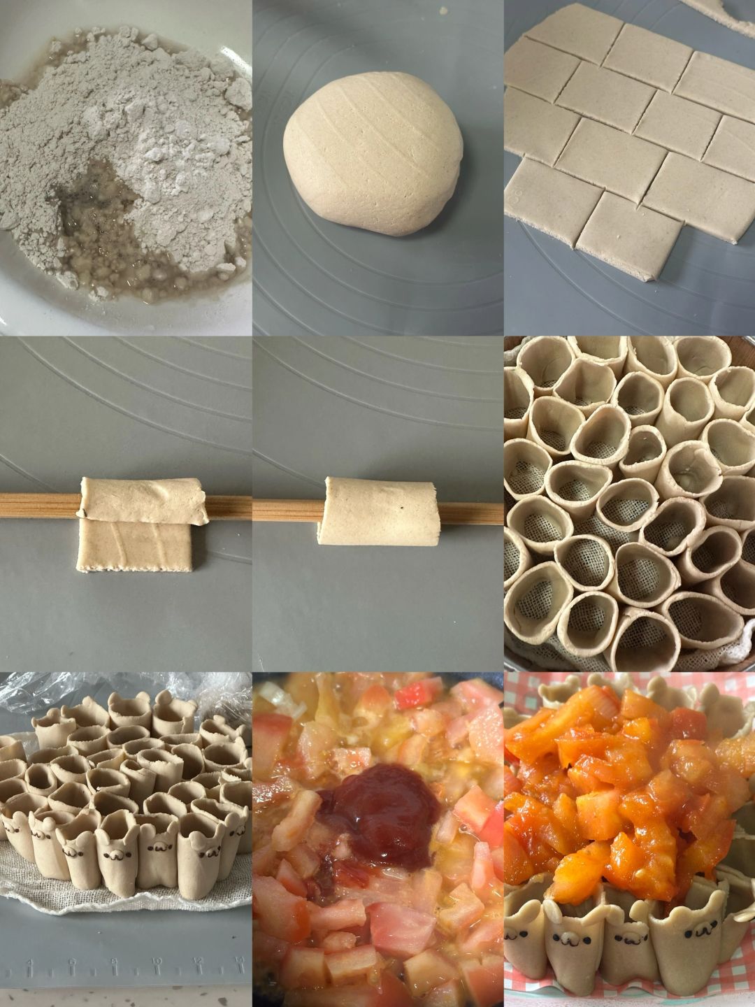 1.莜面配料混合均匀揉光滑,擀扁切成小方块,借助筷子卷成圆筒状,整齐摆放在放好蒸笼布的蒸笼里(最外层的部分做成小熊)水开上气蒸10分钟