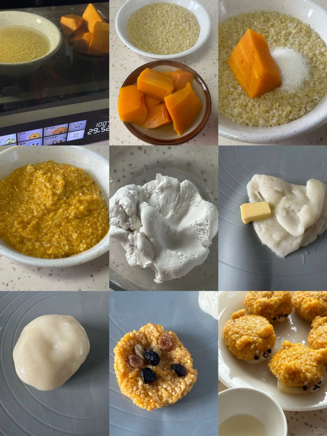 黄米部分:100g大黄米、40g米酒汁、40g水(也可以全用米酒汁)、南瓜、糖(根据自己的米酒汁和南瓜甜度调整)、葡萄干
