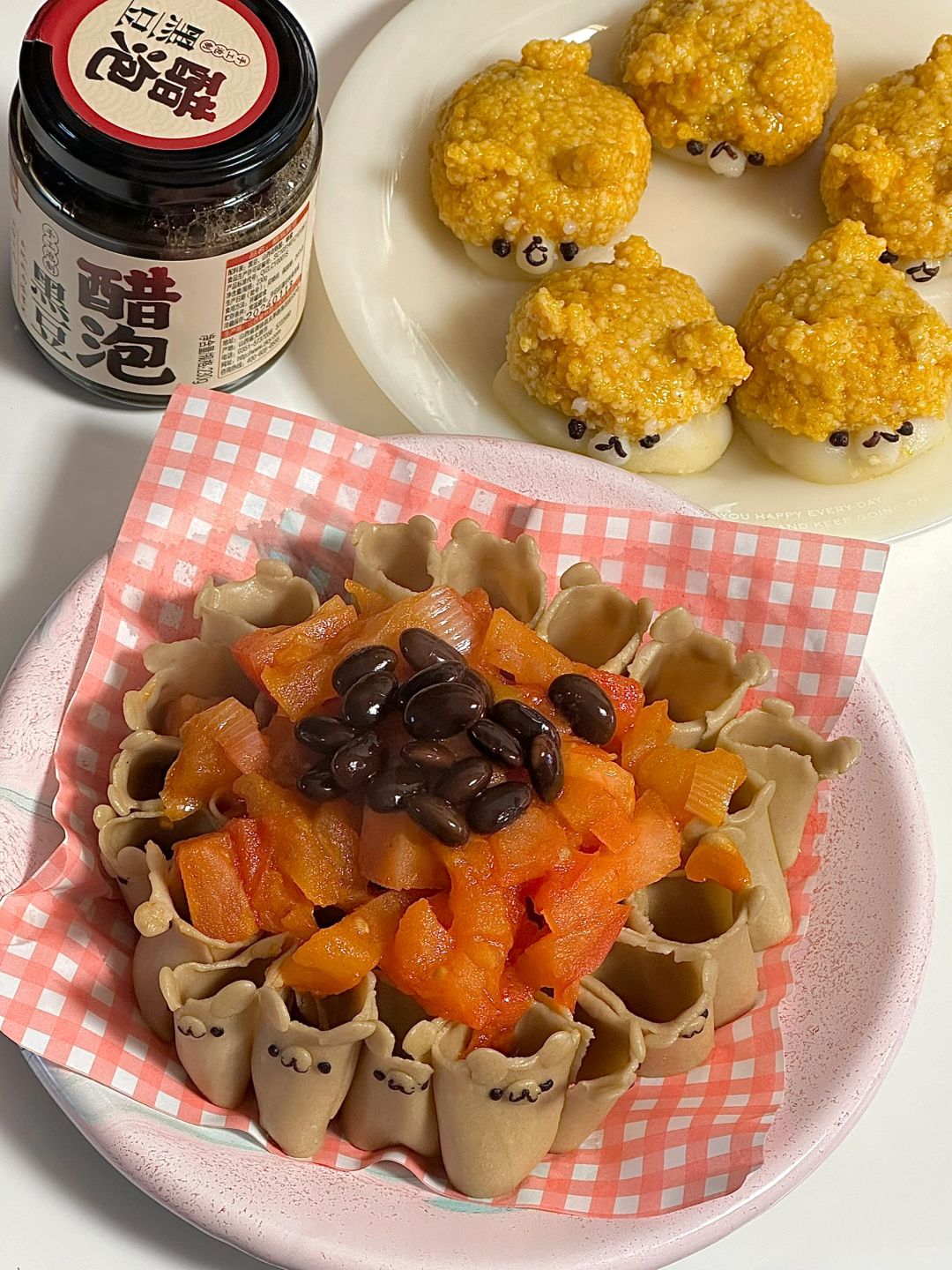 2.番茄丁和葱花一起在锅中炒出汁水,加入番茄酱和盐鸡精煮至番茄软烂,浇在栲姥姥上,再放上醋泡黑豆