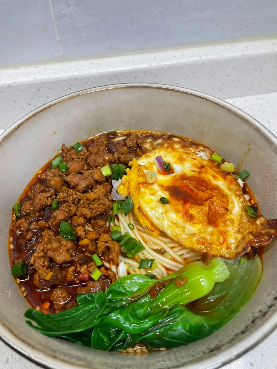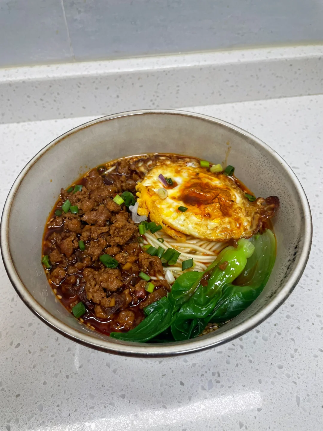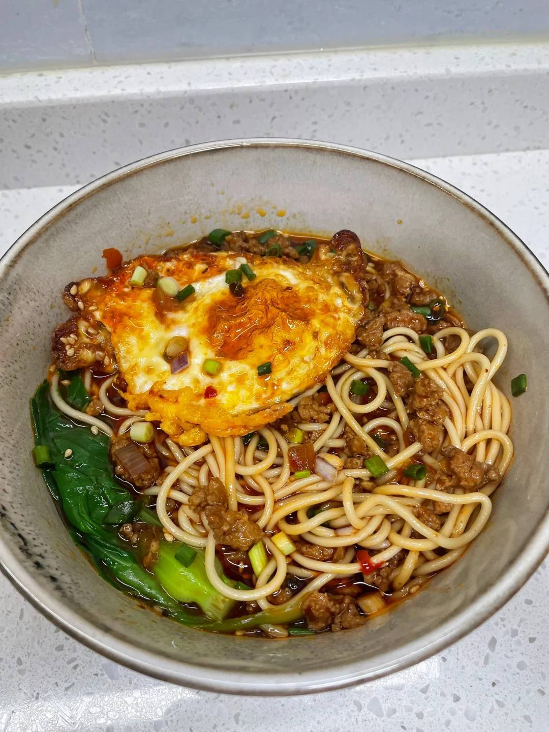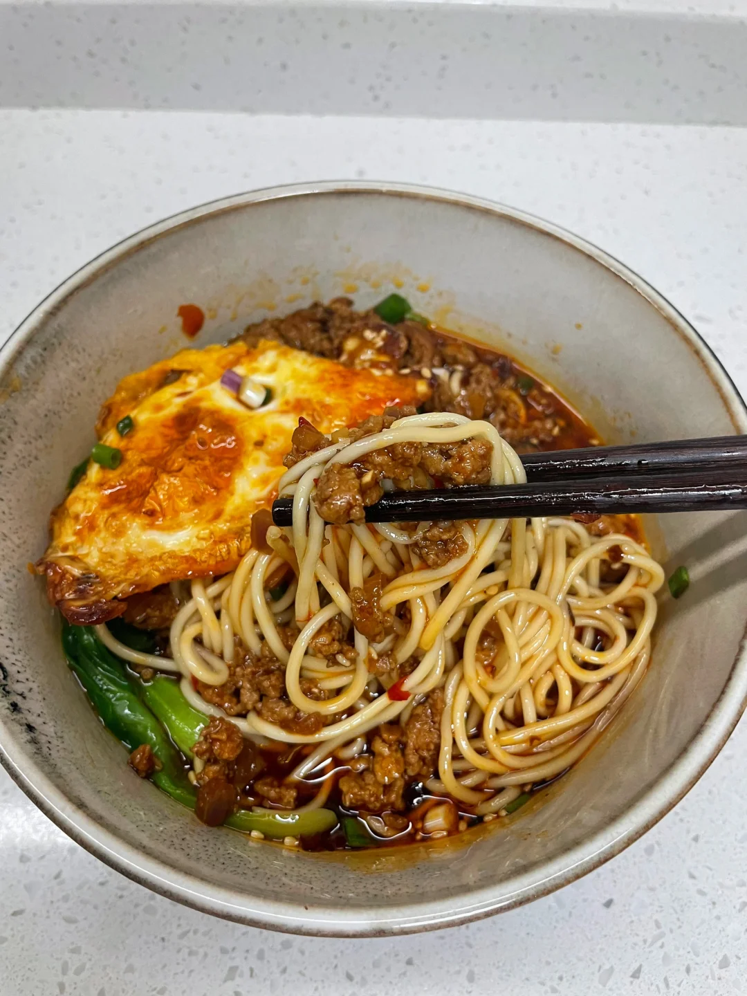 超级好吃的家庭版杂酱面,配上一个煎蛋也太美味了,味道完全不输面馆[派对R] 食材:肉末 洋葱 煎蛋 姜蒜末 葱花 小面 调料:辣椒面 蒜末 白芝麻淋热油,再加入生抽 猪油 胡椒粉 花椒粉 辣椒油 花生碎 葱花 1⃣️:锅中猪油化开后倒入肉末炒至变色,加一勺豆瓣酱,两勺黄豆酱炒出红油,再加入姜蒜末和洋葱炒香,加两勺生抽,半勺老抽,加一碗水煮至浓稠,再加入鸡精和胡椒粉调味即可 2⃣️:面碗中加入面汤,面条煮熟捞出,浇上杂酱肉末拌匀即可