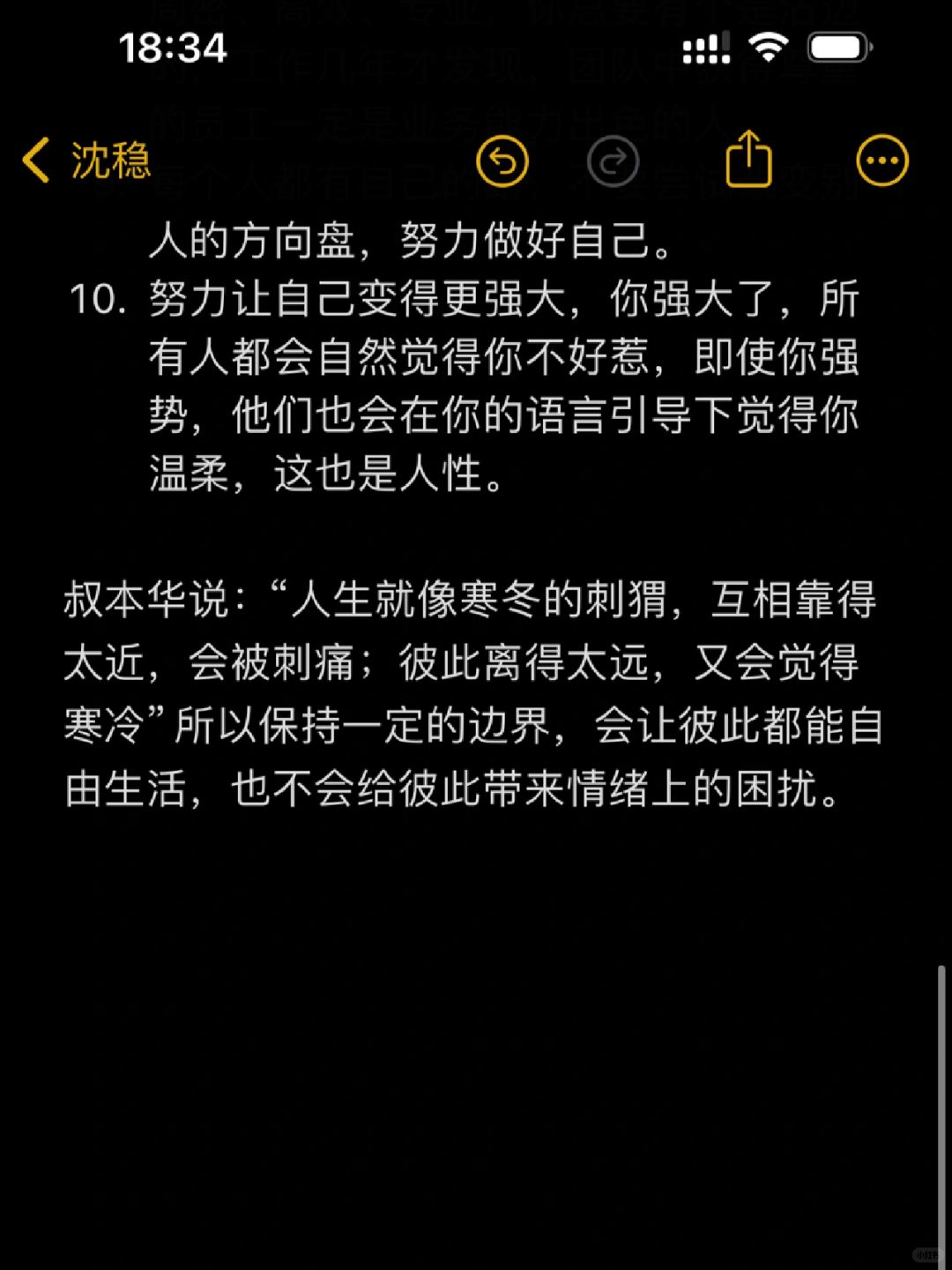 叔本华说:“人生就像寒冬的刺猬,互相靠得太近,会被刺痛;彼此离得太远,又会觉得寒冷”所以保持一定的边界,会让彼此都能自由生活,也不会给彼此带来情绪上的困扰。