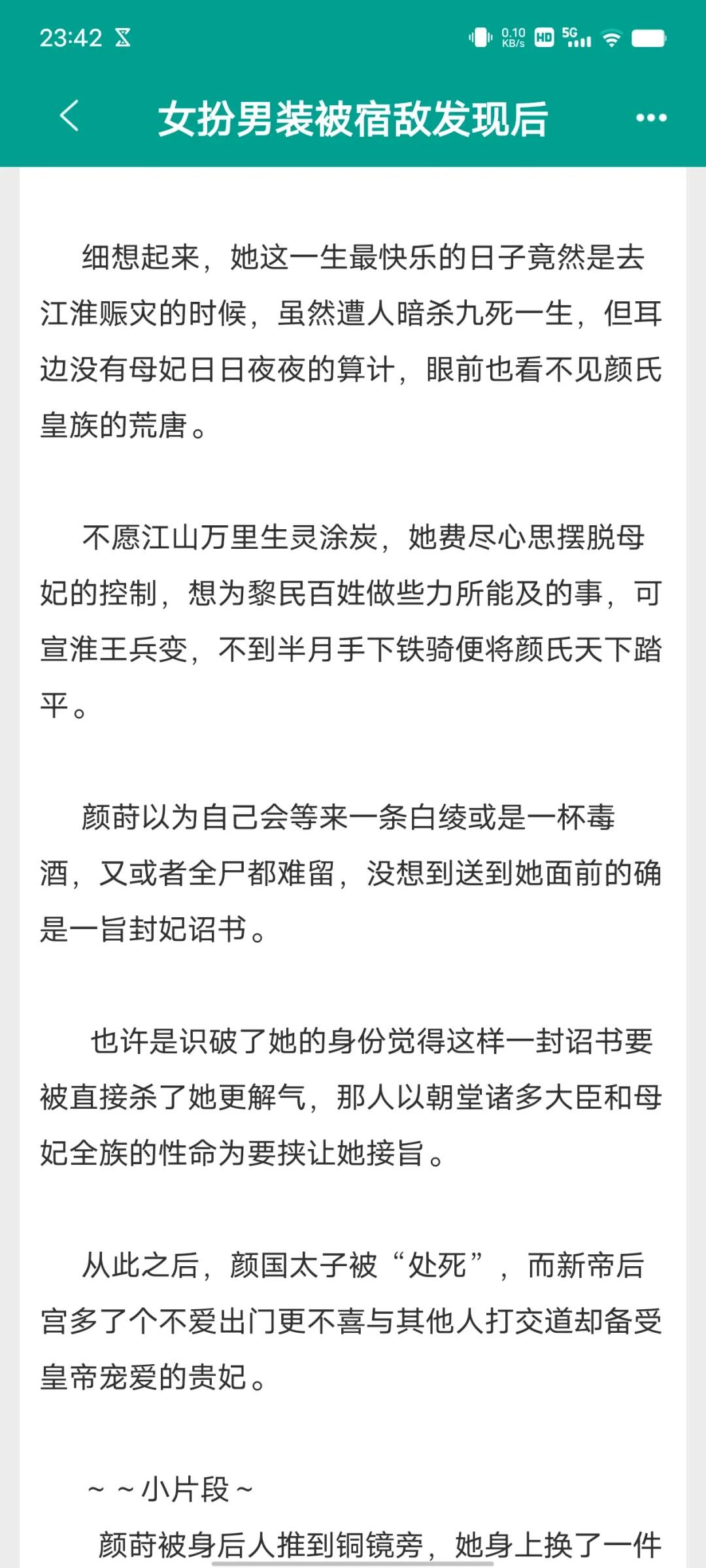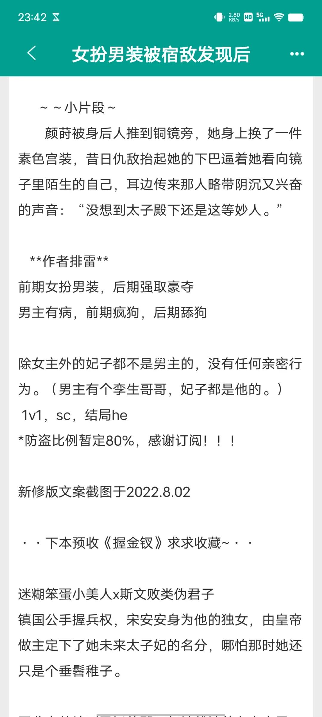 《女扮男装被宿敌发现后》by蓠陌 女扮男装+强取豪夺 刚完结的新文,一共97章 清冷疏离女扮男装假太子x疯批阴厉心狠手辣叛王 **排雷** 前期女扮男装,后期强取豪夺 男主有病,前期疯狗,后期舔狗 除女主外的妃子都不是男主的,没有任何亲密行为。(男主有个孪生哥哥,妃子都是他的。)1v1, 结局he