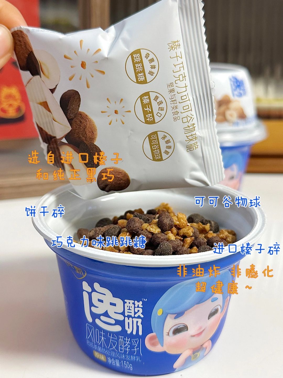 酸奶一尝就是丝滑浓郁的~因为是真正生牛乳发酵的~小料是选用进口榛子🌰和纯正黑巧🍫