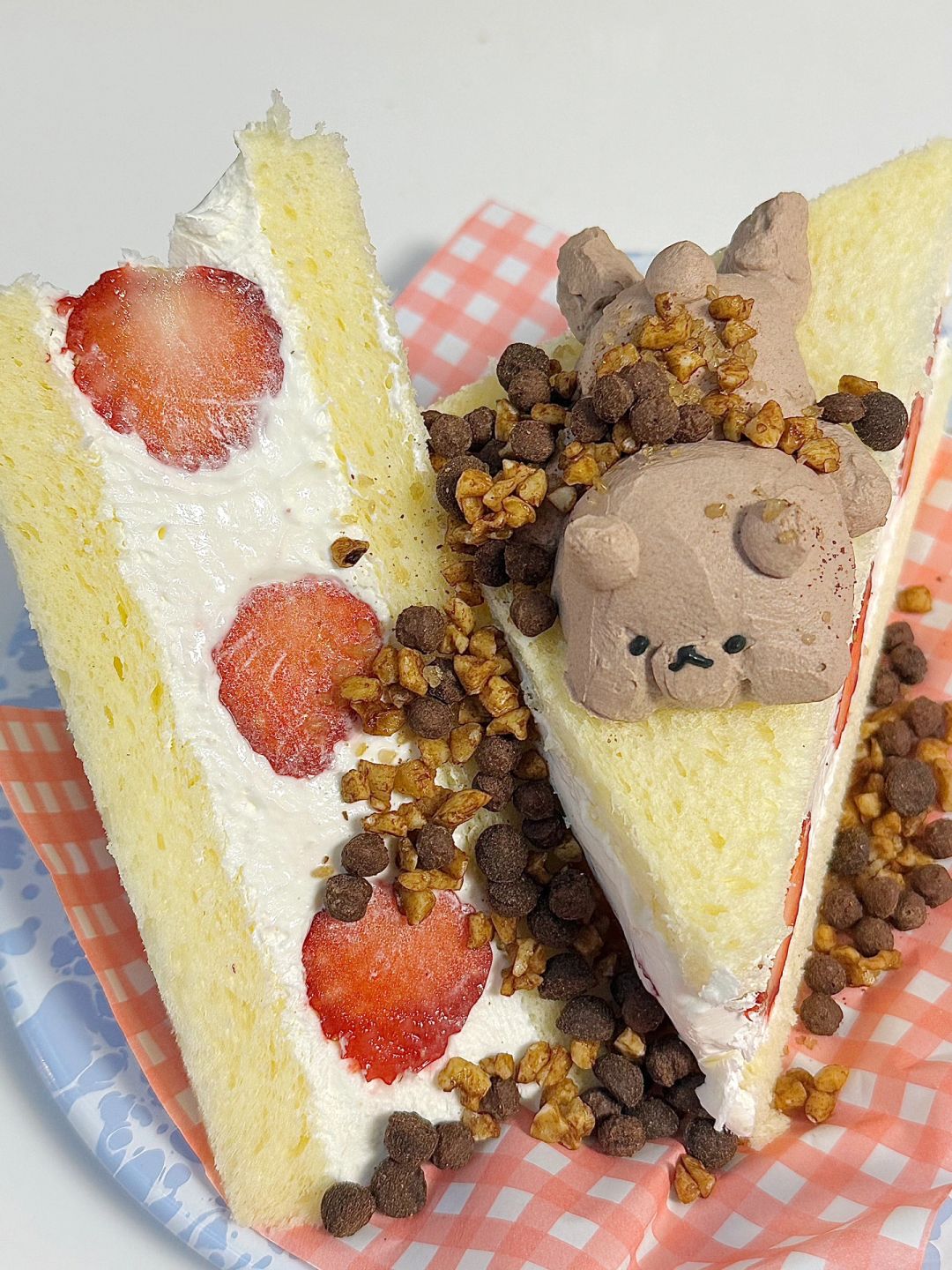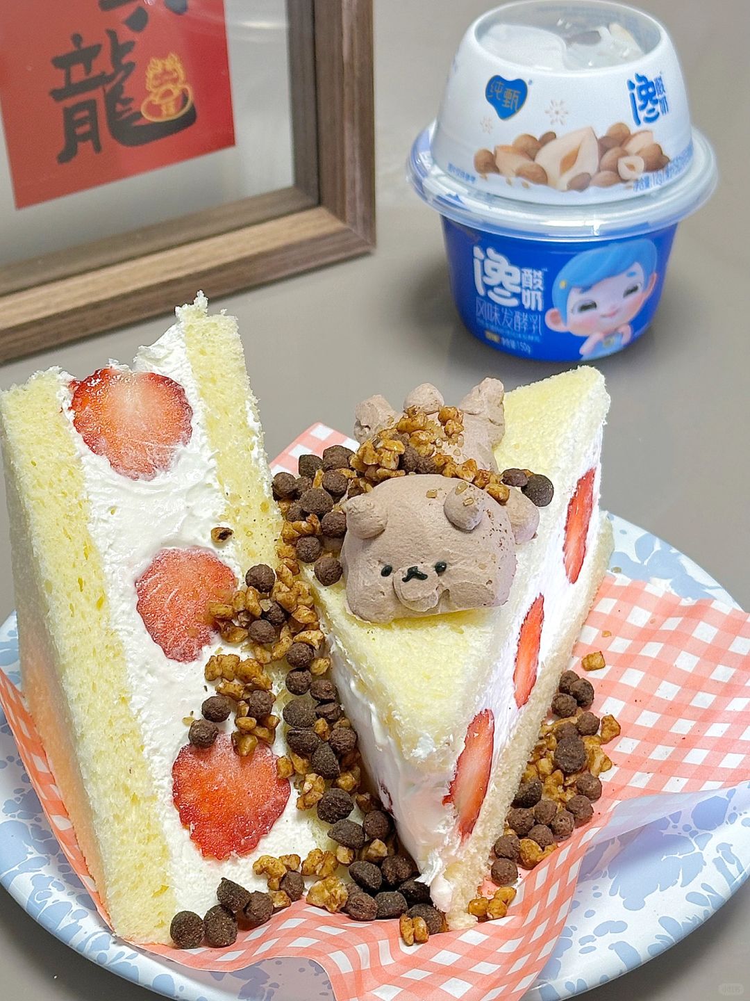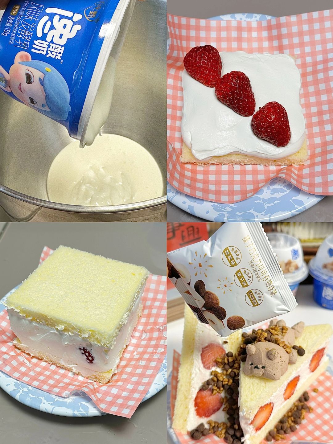 做法:酸奶🥛加入奶油打发,吐司片切去边边涂抹上奶油,放上草莓🍓再涂一层奶油,盖上另一片吐司,冷冻后切开,再用可可粉调色后的奶油挤上小熊🐻