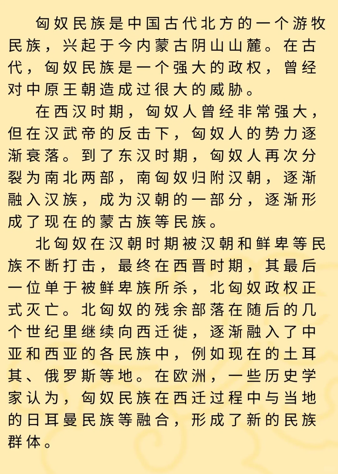 ✂️北匈奴在汉朝时期被汉朝和鲜卑等民族不断打击,最终在西晋时期,其最后一位单于被鲜卑族所杀,北匈奴政权正式灭亡。北匈奴的残余部落在随后的几个世纪里继续向西迁徙,逐渐融入了中亚和西亚的各民族中,例如现在的土耳其、俄罗斯等地。在欧洲,一些历史学家认为,匈奴民族在西迁过程中与当地的日耳曼民族等融合,形成了新的民族群体。