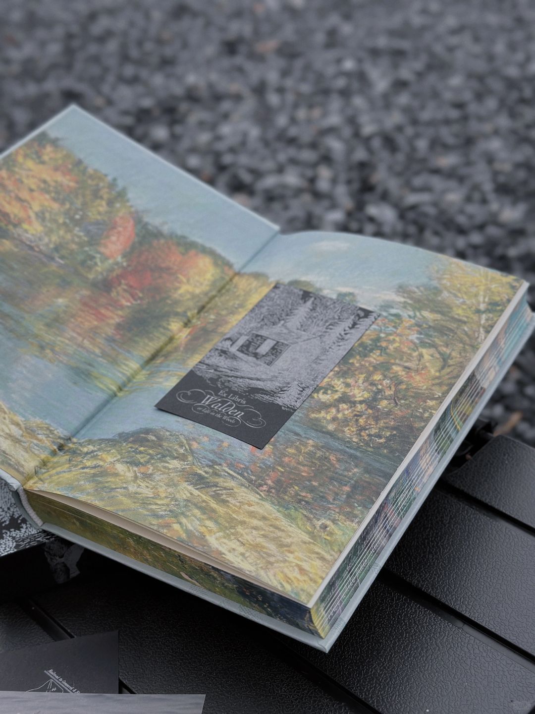 除了和精装版一样的硬壳函套,清新淡雅的湖蓝底色外,特装版的环衬是整版的瓦尔登湖满印彩图!书口三边全彩喷绘,是油画大师谢尔盖·维诺格拉多夫的画作。