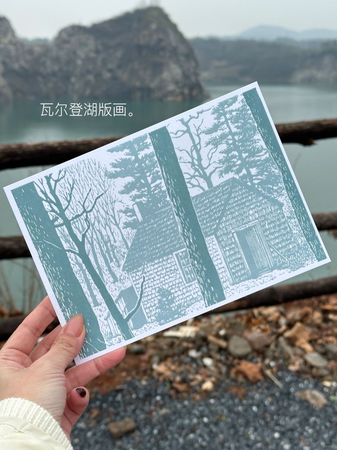 随书附赠除了硫酸纸书签+藏书票+瓦尔登湖地图外,还随机赠出木质印章或装饰版画,我收到的是蓝色的版画卡,爱惨了!