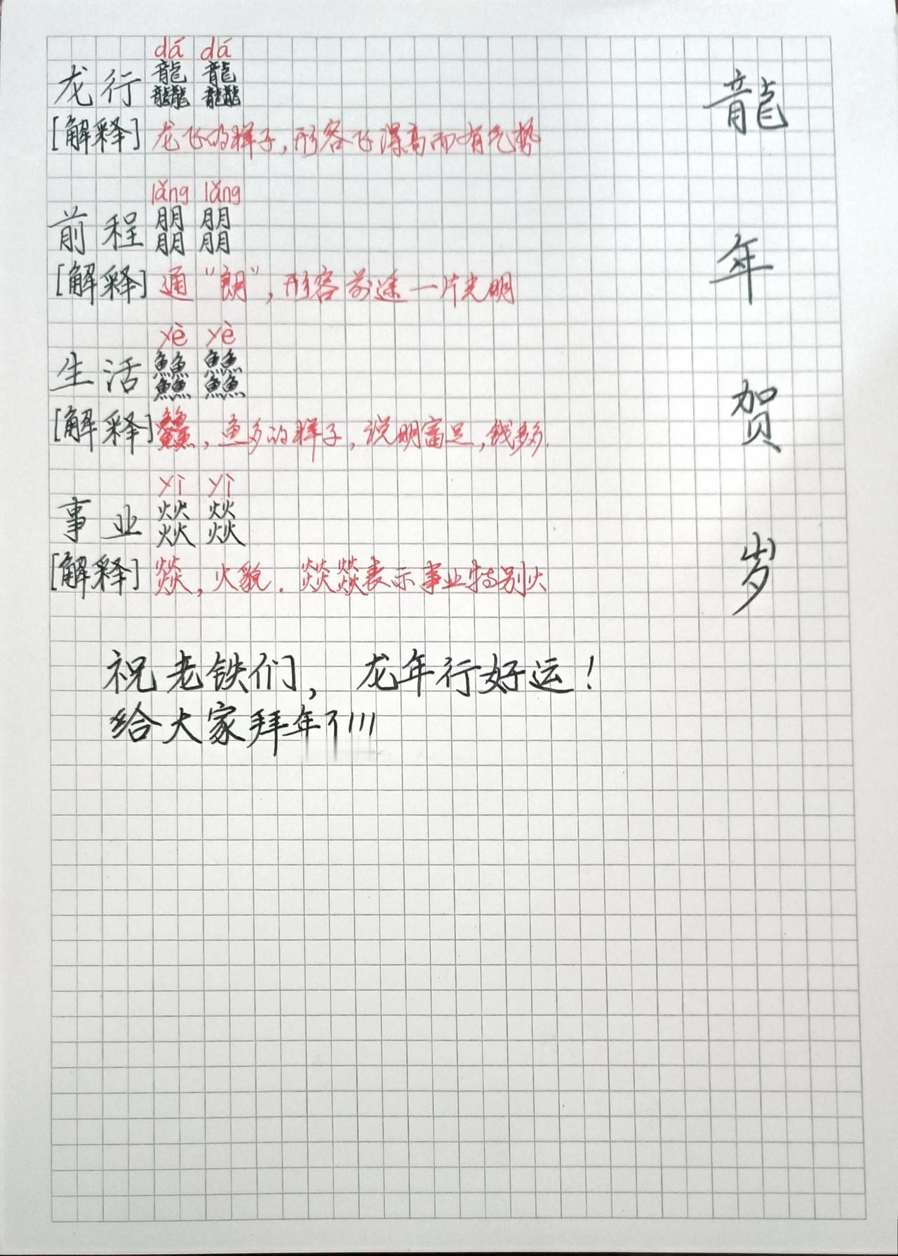 一起领红包> 龙年大吉,龙年行龙运! 祝您在新的一年里,龙行龘龘,前程朤朤,生活鱻鱻,事业燚燚!! 关注我@丰哥实用写字 一手好字,一生自信! 横竖撑天地,撇捺写人生!