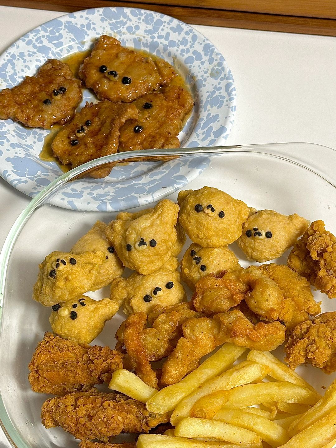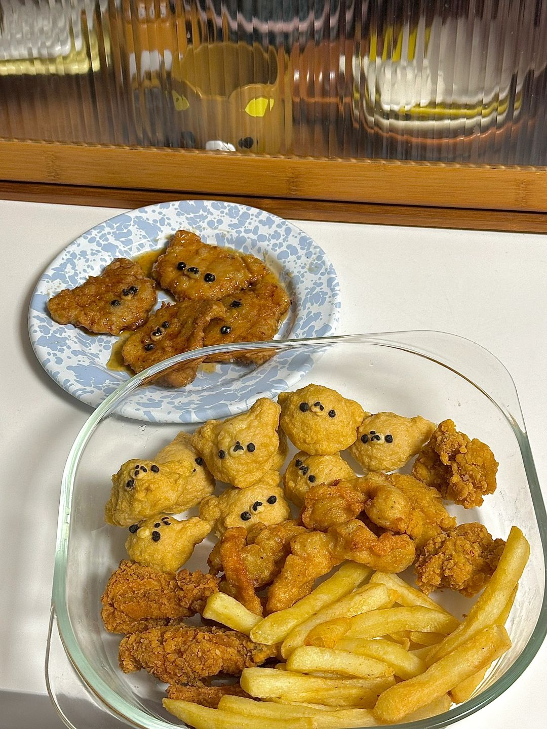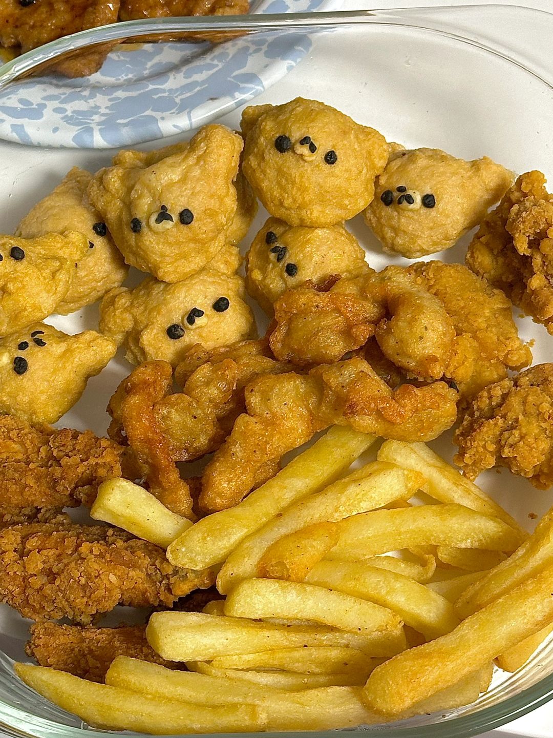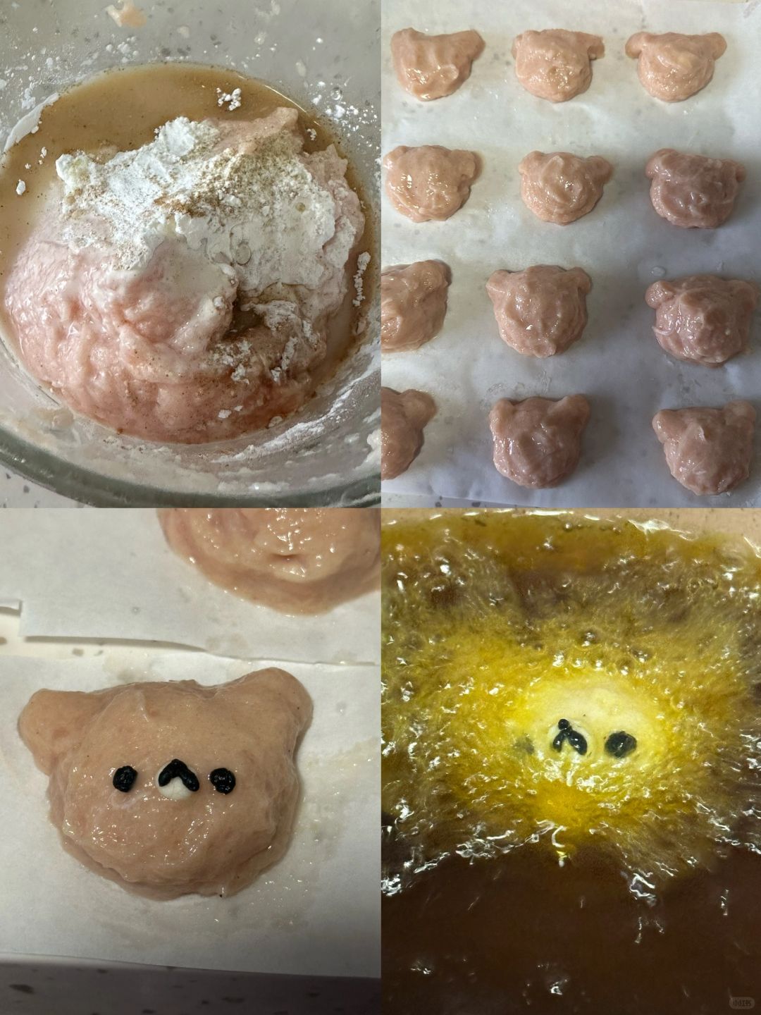 1.鸡块的鸡肉打烂,加入所有配料混合均匀,搅打上劲,装入裱花袋在烘焙纸上挤出小熊,装饰上表情,炸至表面金黄