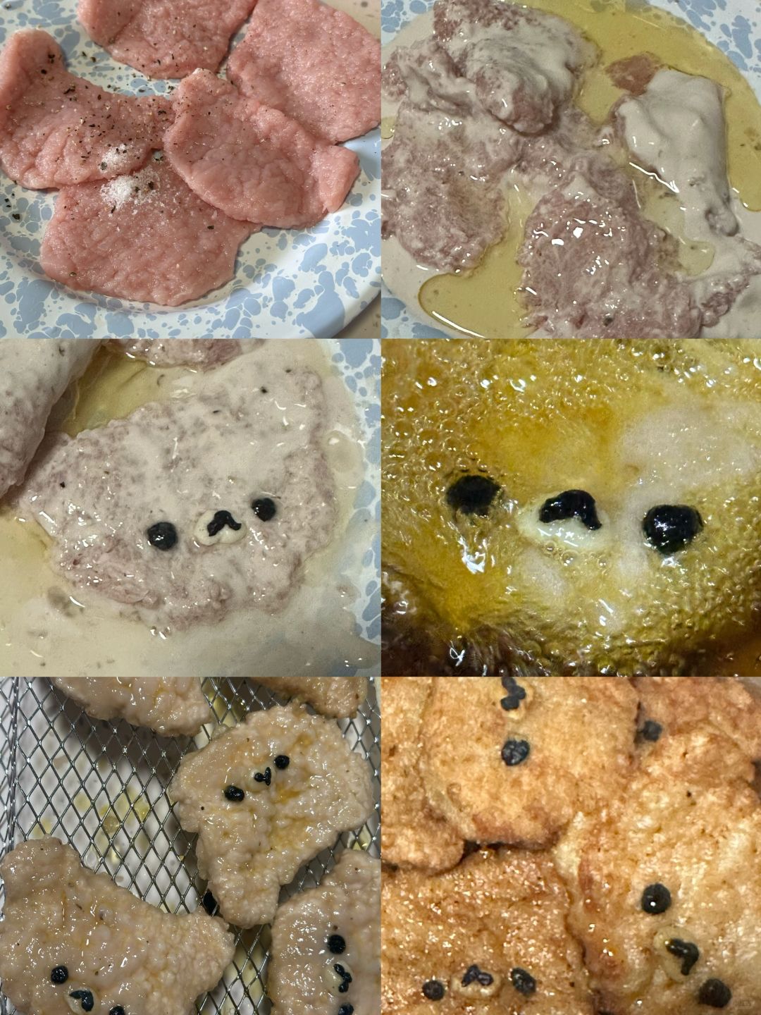 2.肉片锤断肌肉,剪出小熊的形状,加入盐和胡椒腌15分钟,再加入泡好的淀粉和油均匀包裹肉,沾上表情炸定型,再升高油温炸至金黄,酱料煮至浓稠后加入肉裹匀
